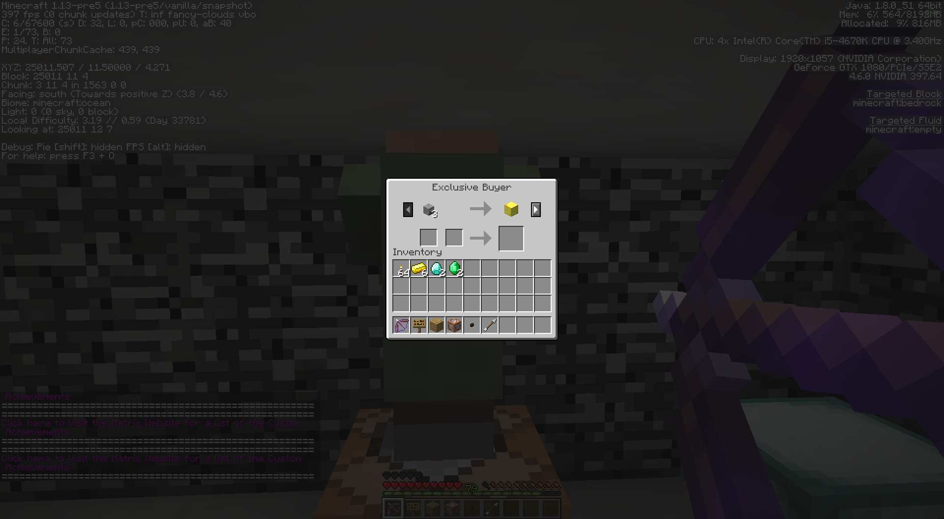 /summon villager ~ ~0.5 ~ {Invulnerable:1,PersistenceRequired:1,Silent:1,NoAI:1,Rotation:[0f,0f],CustomName:"\"Block Trader\"",CustomNameVisible:1,Profession:5,Career:1,CareerLevel:0,Offers:{Recipes:[ {buy:{id:gold_block,Count:1},sell:{id:brown_wool,Count:1},rewardExp:0b,maxUses:2147483647}, {buy:{id:gold_block,Count:1},sell:{id:white_stained_glass_pane,Count:1},maxUses:2147483647}]}}Hold a Bow and Arrows in your Inv, whilst making sure the bow is active in main hand