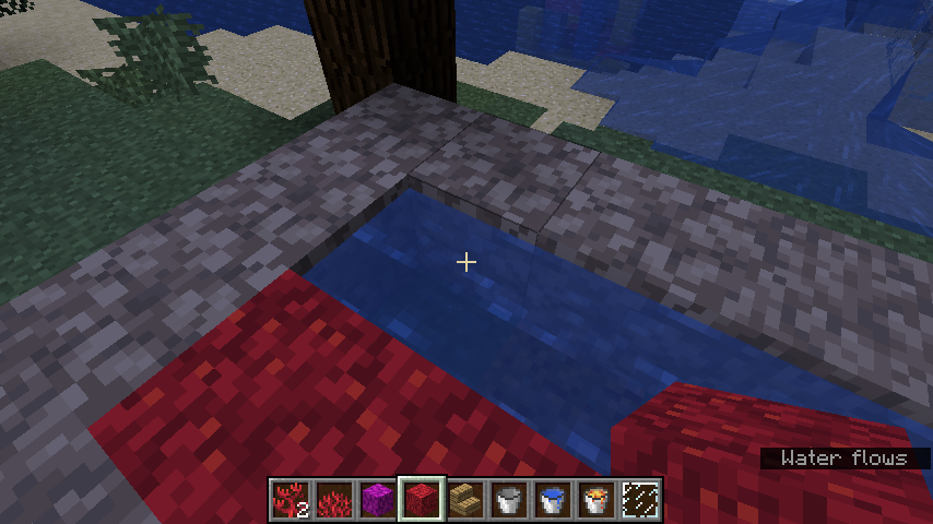 2) Collect one of the two source blocks at the far left, wait some seconds, and collect the other. The pond still looks the same.