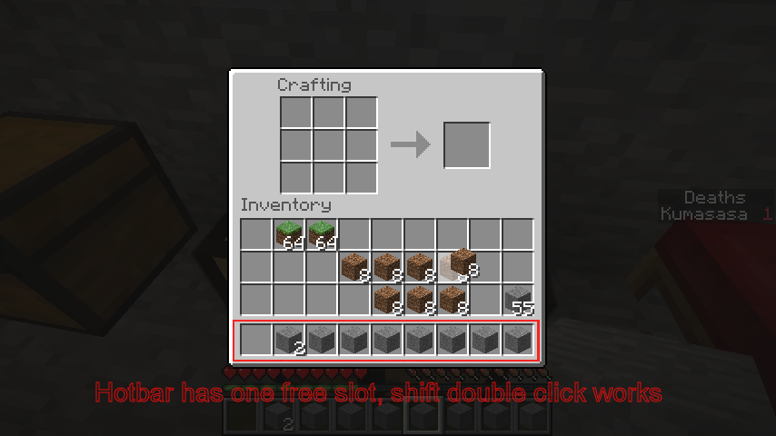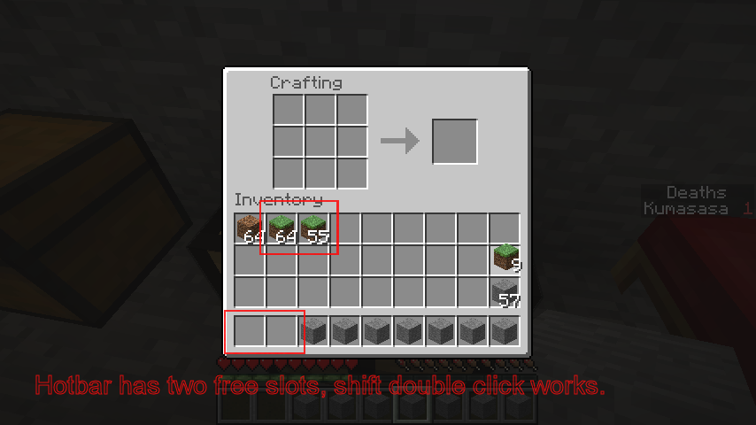 When combining items in the inventory with shift-double click there need to be free slot(s) in the hotbar according to the number of the resulting stacks.