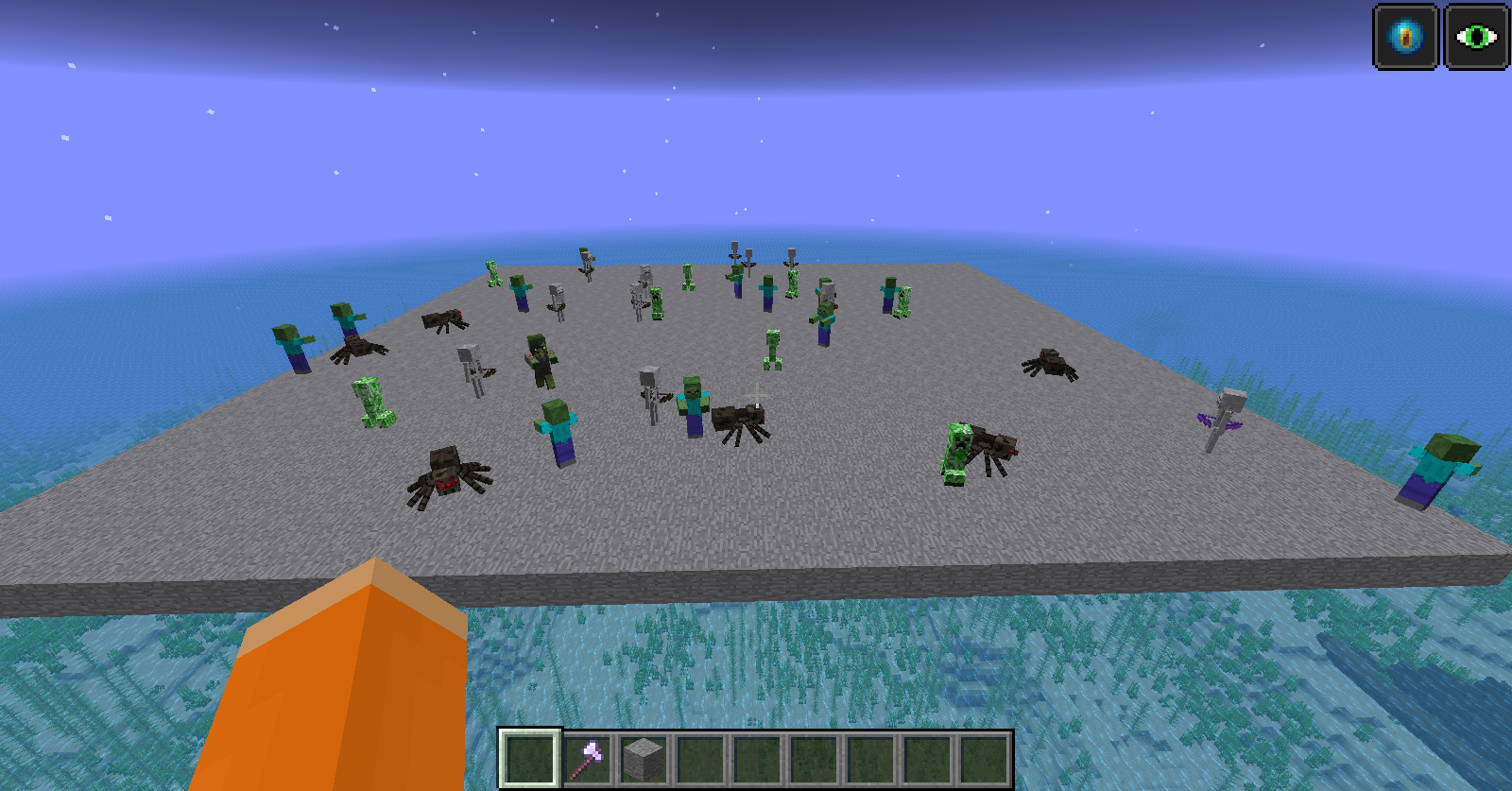 Waiting about 5 mins on a small stone platform I placed above the ocean after the drowned test, and again 14000 ticks and killing entities first, I got 12 zombies, 8 creepers, 6 spiders and 11 skeletons.