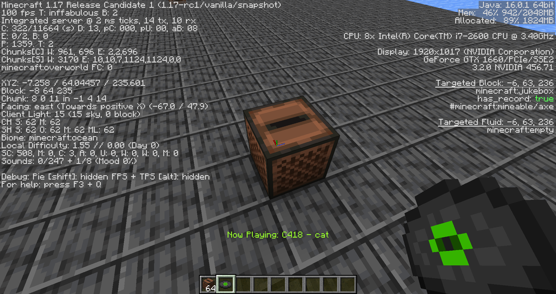 Observe the text color change of a disc in a jukebox in Minecraft 1.8 or older