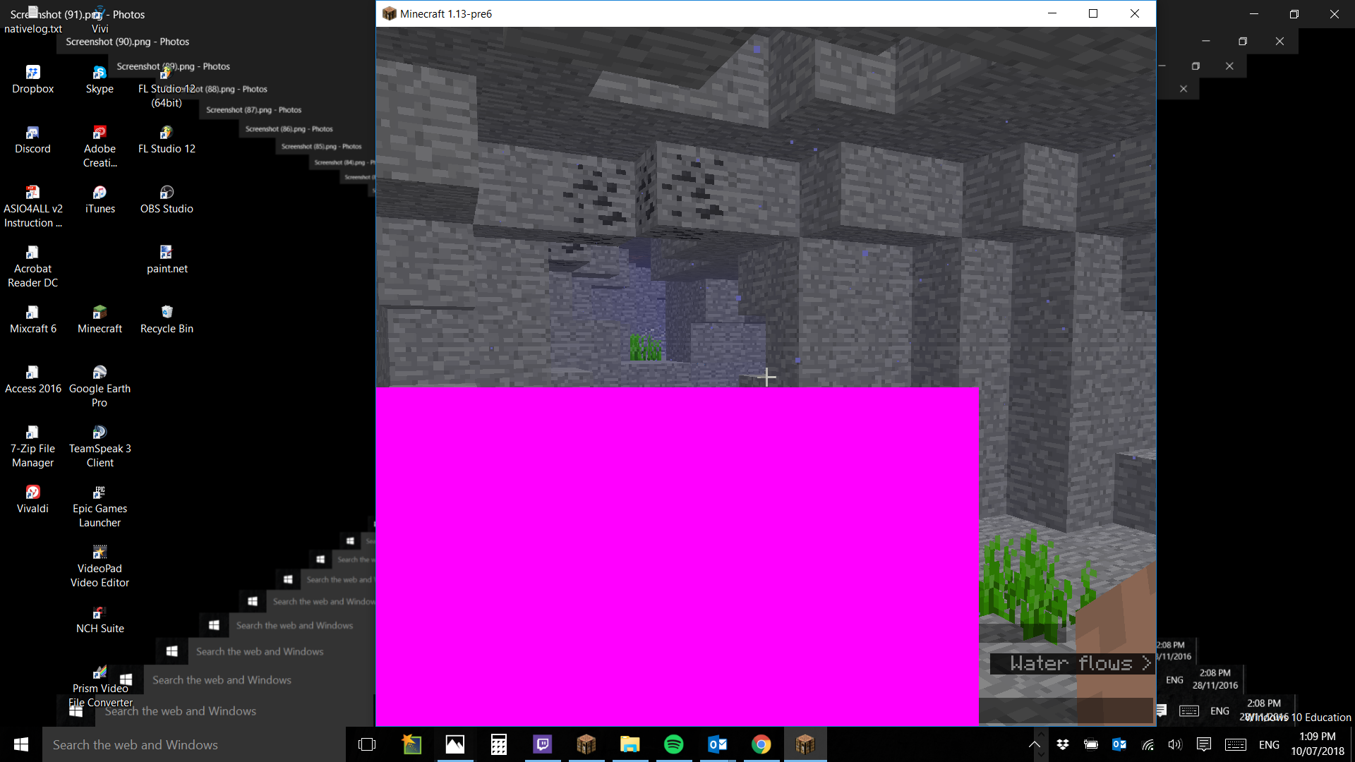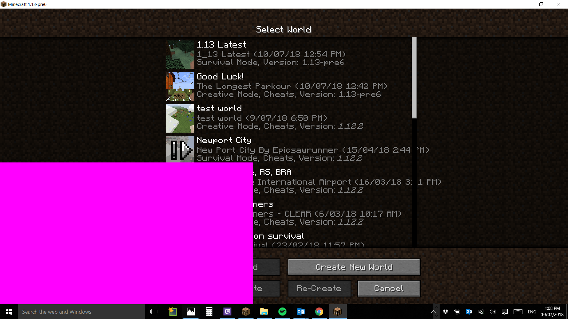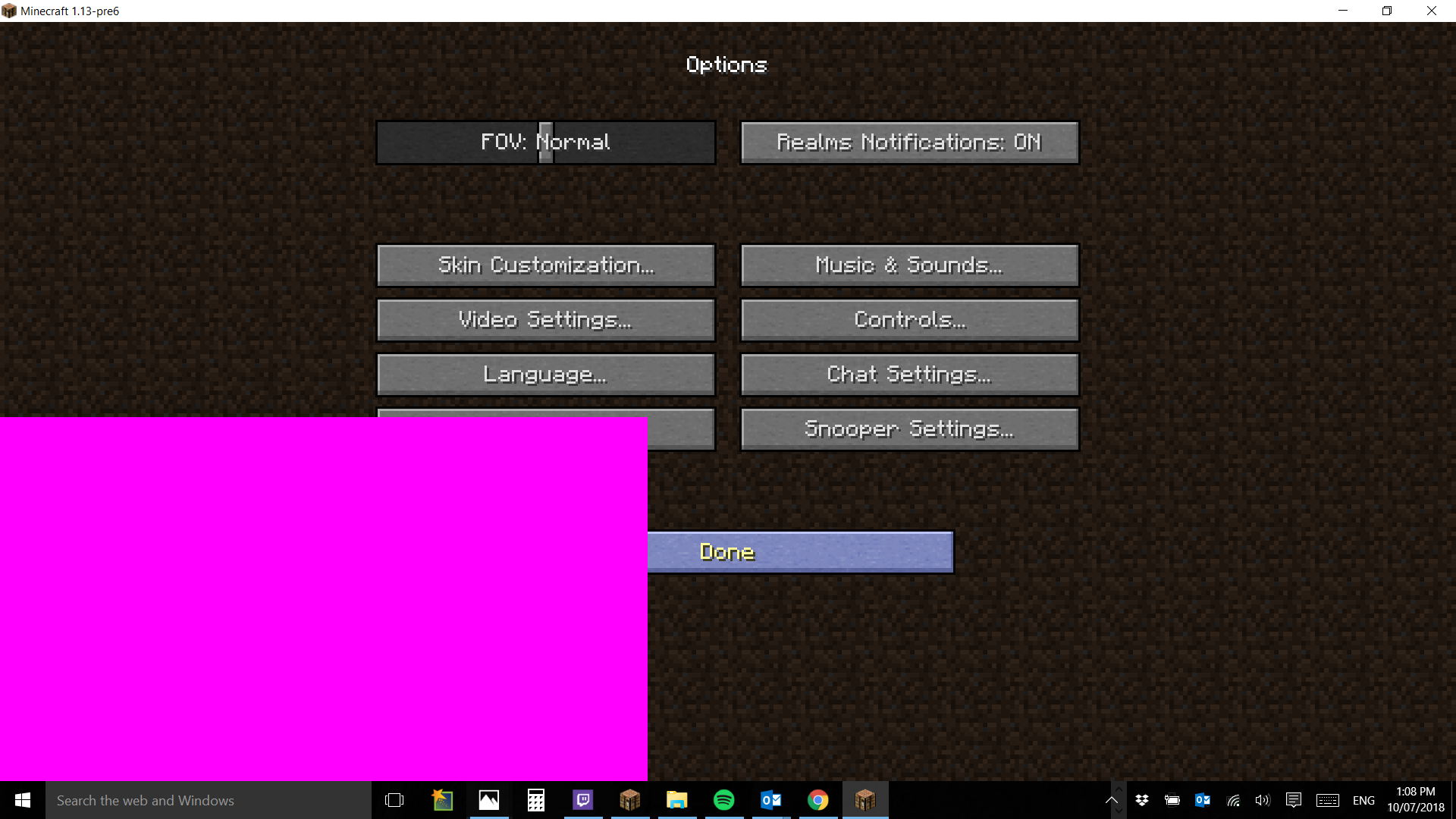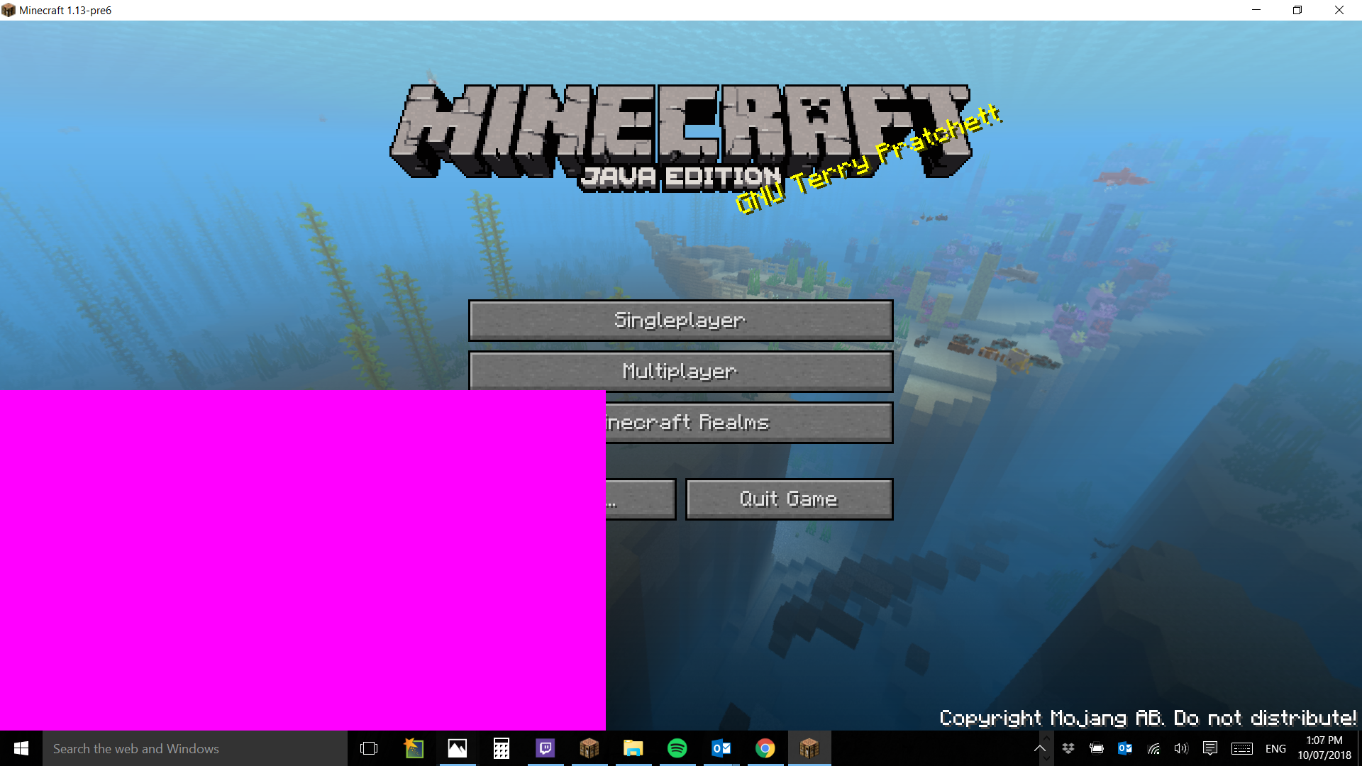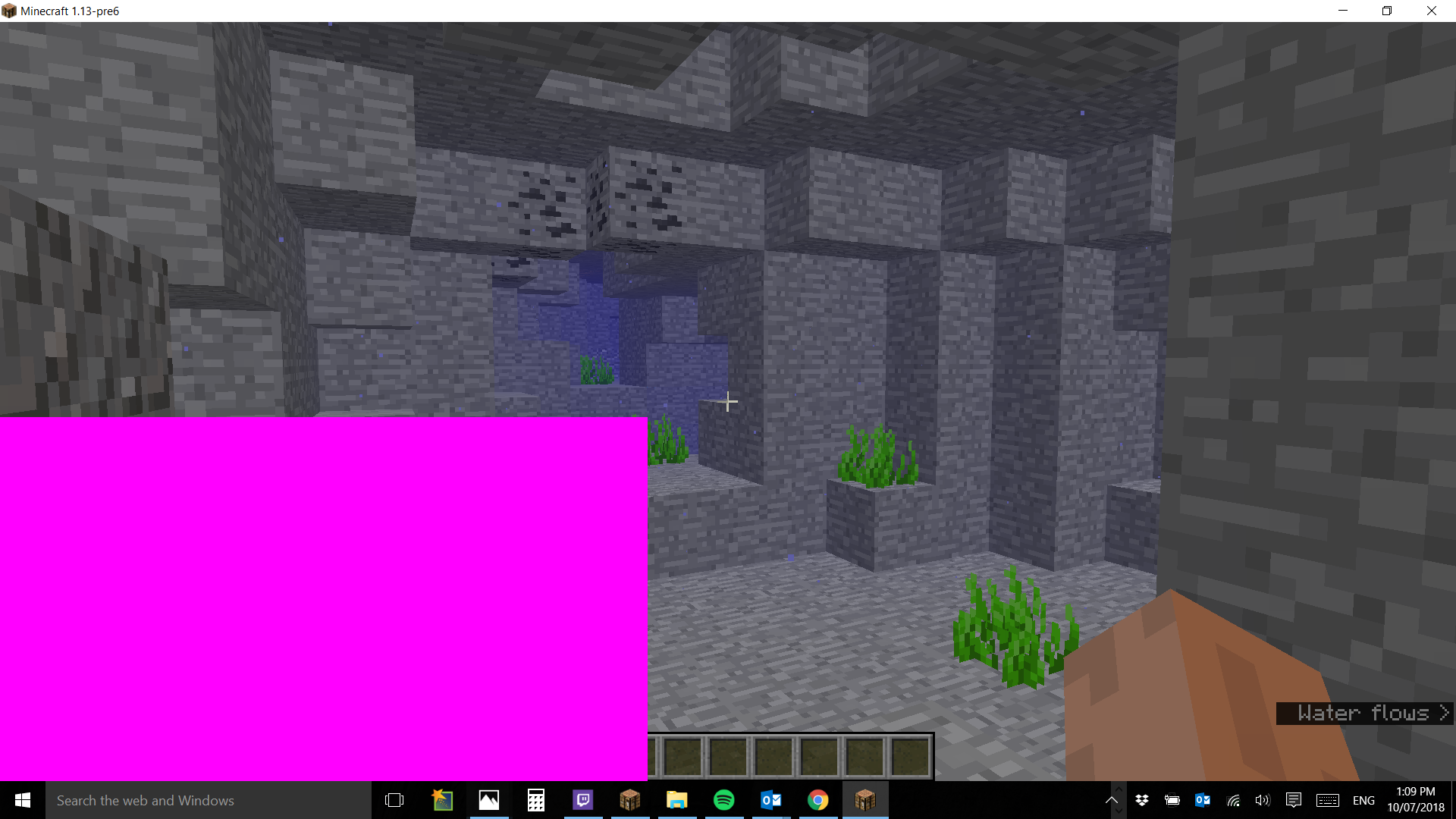 In the 1.13 pre-6 update, I launched the version successfully and played in a few of my worlds. Afterwards, I put my computer to sleep without closing Minecraft. About 10 minutes later I reopened my computer to find the entire bottom-left corner hidden like a missing texture.