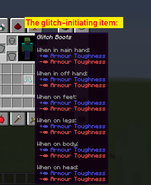 This is a strange and potentially game-breaking bug, initiated via a very unusual process. View the attached images in the correct order (1, 2, then 3) to see how it is done. In summary (though I strongly recommend you view the images), the bug is created while wearing boots with +Infinity and -Infinity (yes, infinity. Not some obscenely large number, not the ∞ character, but an actual infinite attribute, which is possible in Minecraft with some work and/or modification) Armor Toughness attribute, and taking normally-fatal damage while wearing them. This initiates a strange state. View the images to see what I'm talking about.