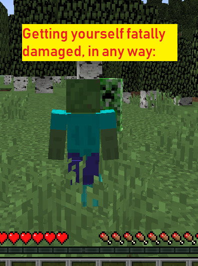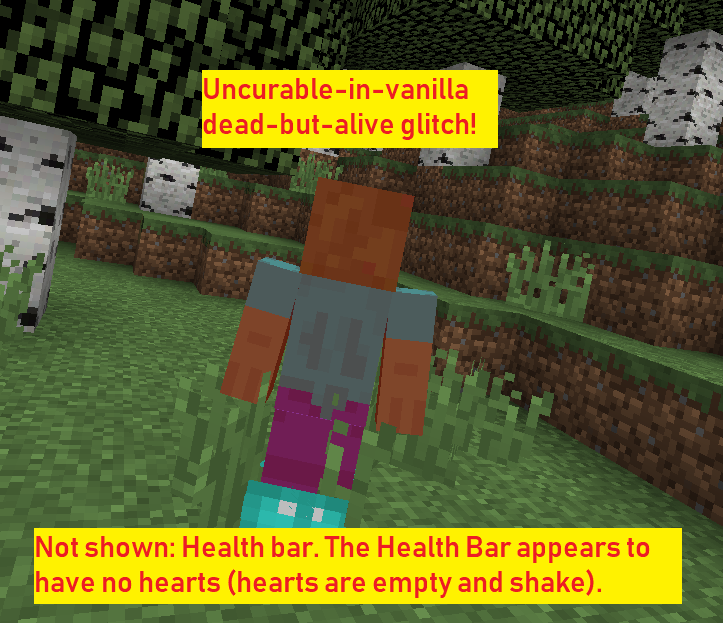 Hello, Kumasasa, I hate to be annoying, but this but is not at all the same as MC-19690. I know the “fake death” glitch, I have done it; it’s not the same as this. Unlike in MC-19690, here you do not receive a death message at all, here your screen jitters as if you were dead, here you actually appear in game mode survival to have no health. Sorry to annoy you, yet again, but this is a decidedly unique bug.