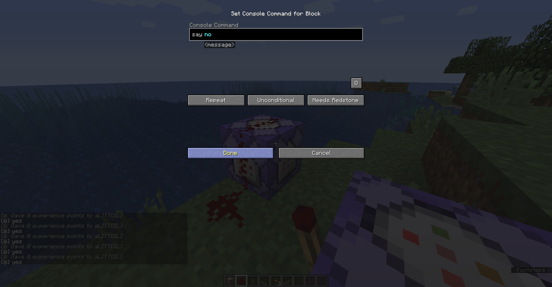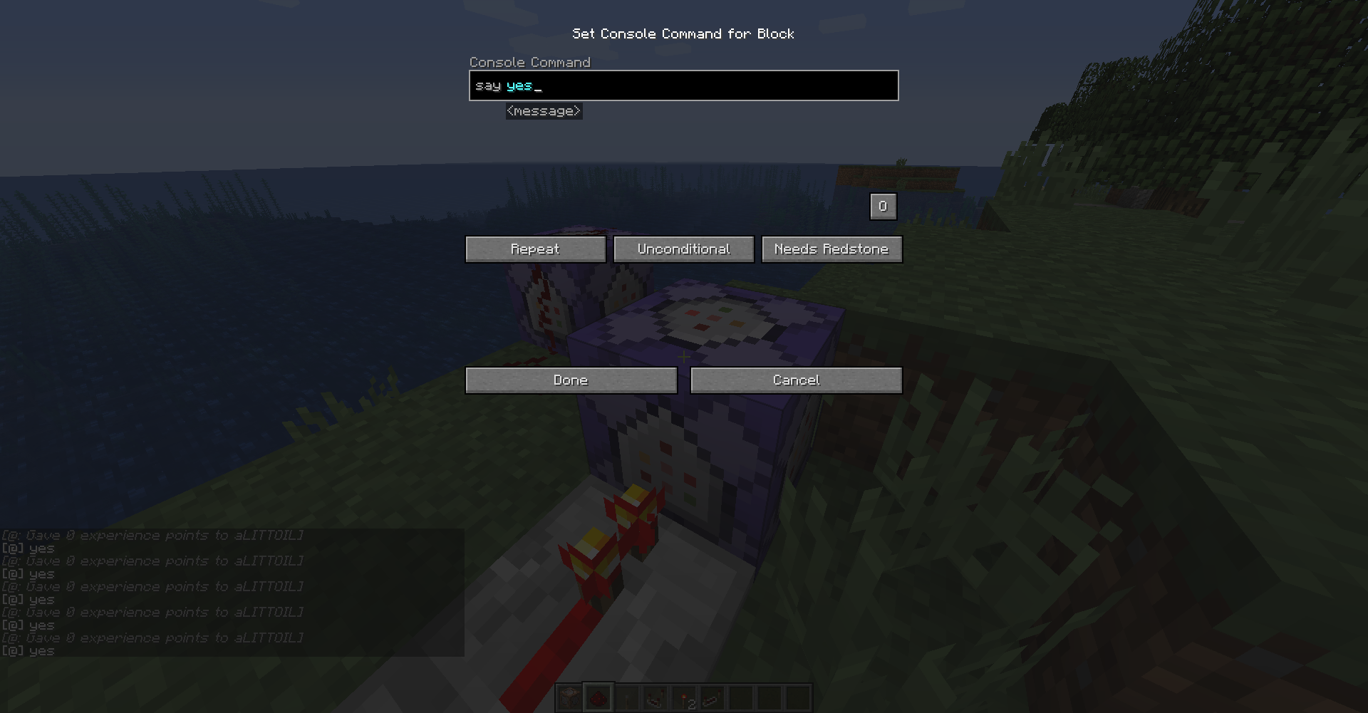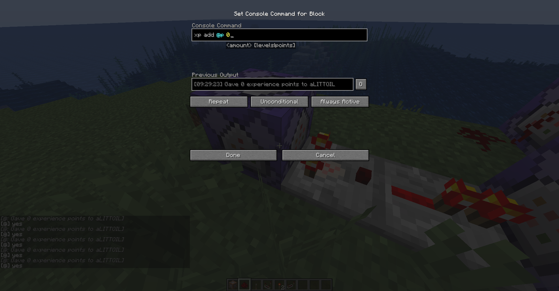 With my simple command block contraption in this brand new world, we can see that when the redstone signal from the repeating 'xp add @p 0' command block turn off, and powers the 'say no' command block, otherwise the 'say yes' command block is on. When looking at the log(chat fills up too fast), we normally see the a spam of 'yes'es, but upon logging in, we get a spam of both 'yes'es and 'no's.