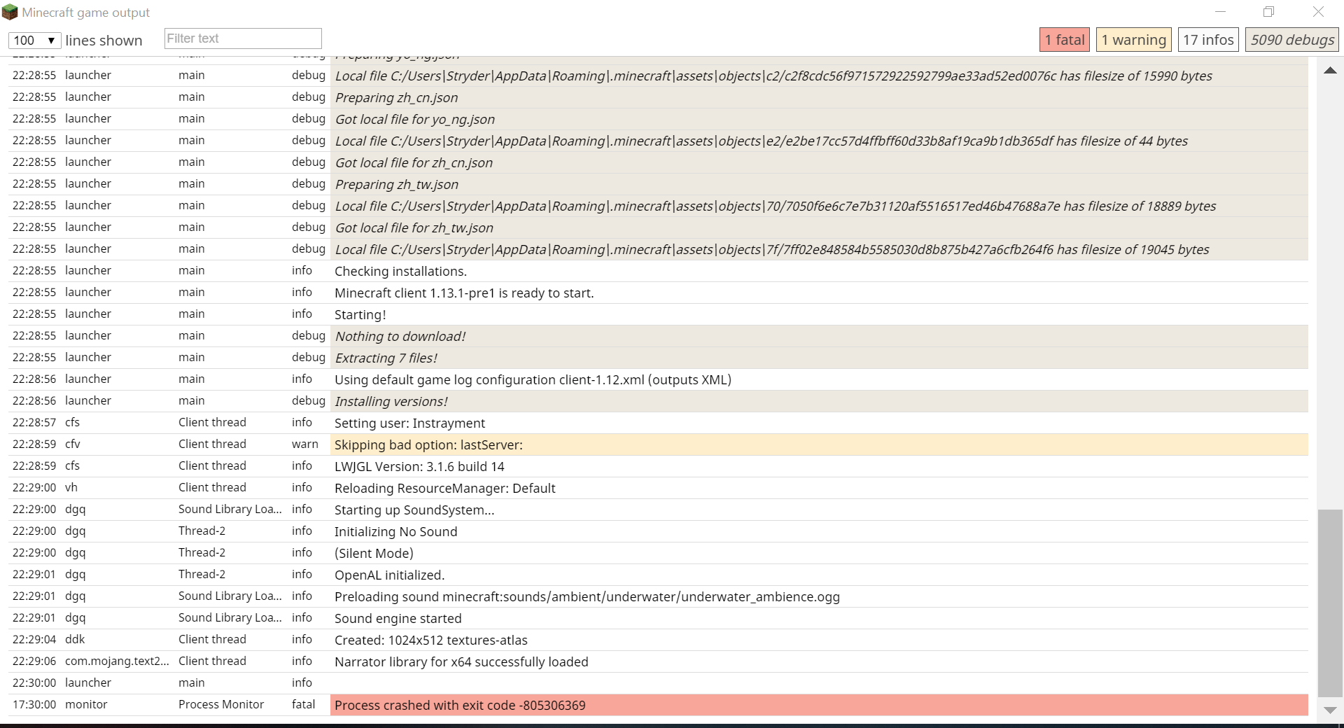 Whenever I boot up Minecraft 1.13, it crashes right at the menu, and does this several times before finally working. It also sometimes freezes when on the pause menu for long periods of a time (when I'm texturing or something) and thus, results in a crash.
