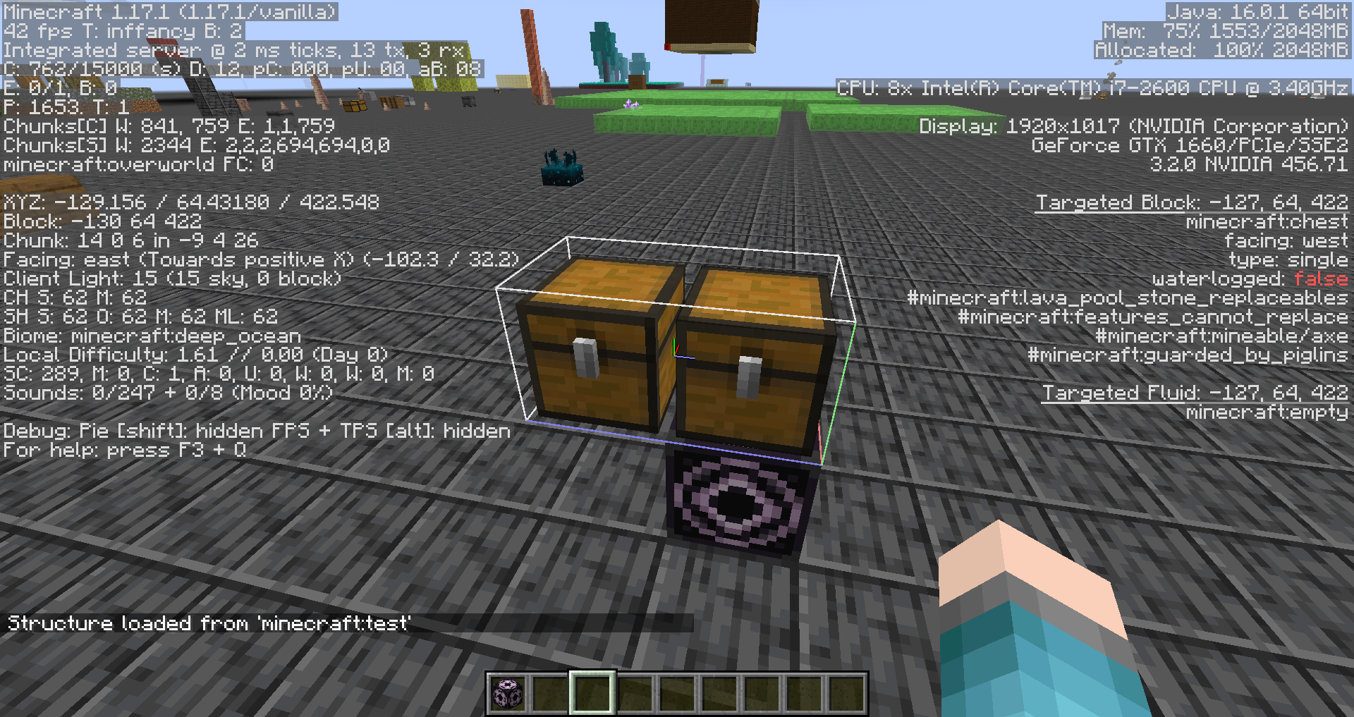 When loading any structure that contains a double chest, that chest will always load as two independent single chests if the structure is being mirrored. This happens regardless of the orientation of the chest, the direction of the mirroring, and the rotation of the structure.