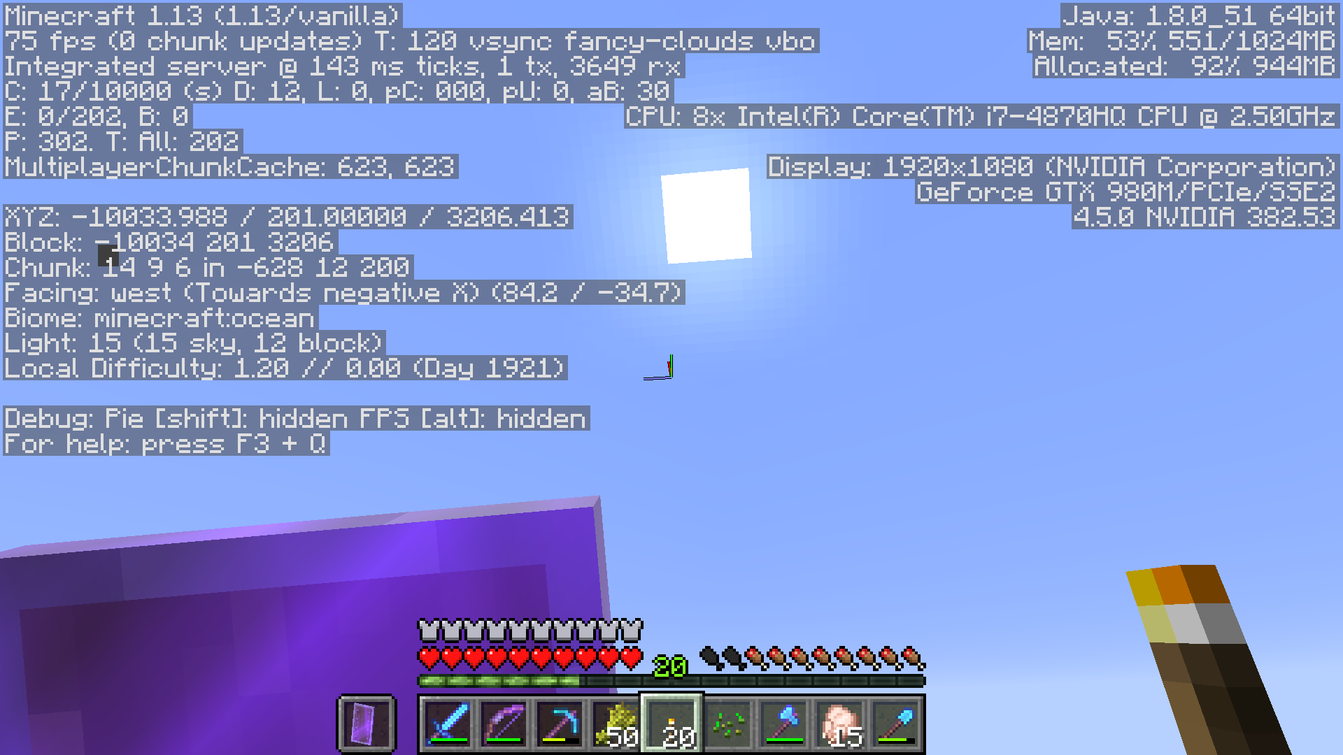 Added debug screen screenprint (processor speed, java version, some chunk info, FPS, etc). Lag issue is very pronounced in this area. Perhaps the initial chunk conversion had a glitch? subsequent chunk loading seems to be ok- the sun and animals don't lag when other, more distant chunks were loaded into the game (i.e. the nether, more distant Overworld chunks).
