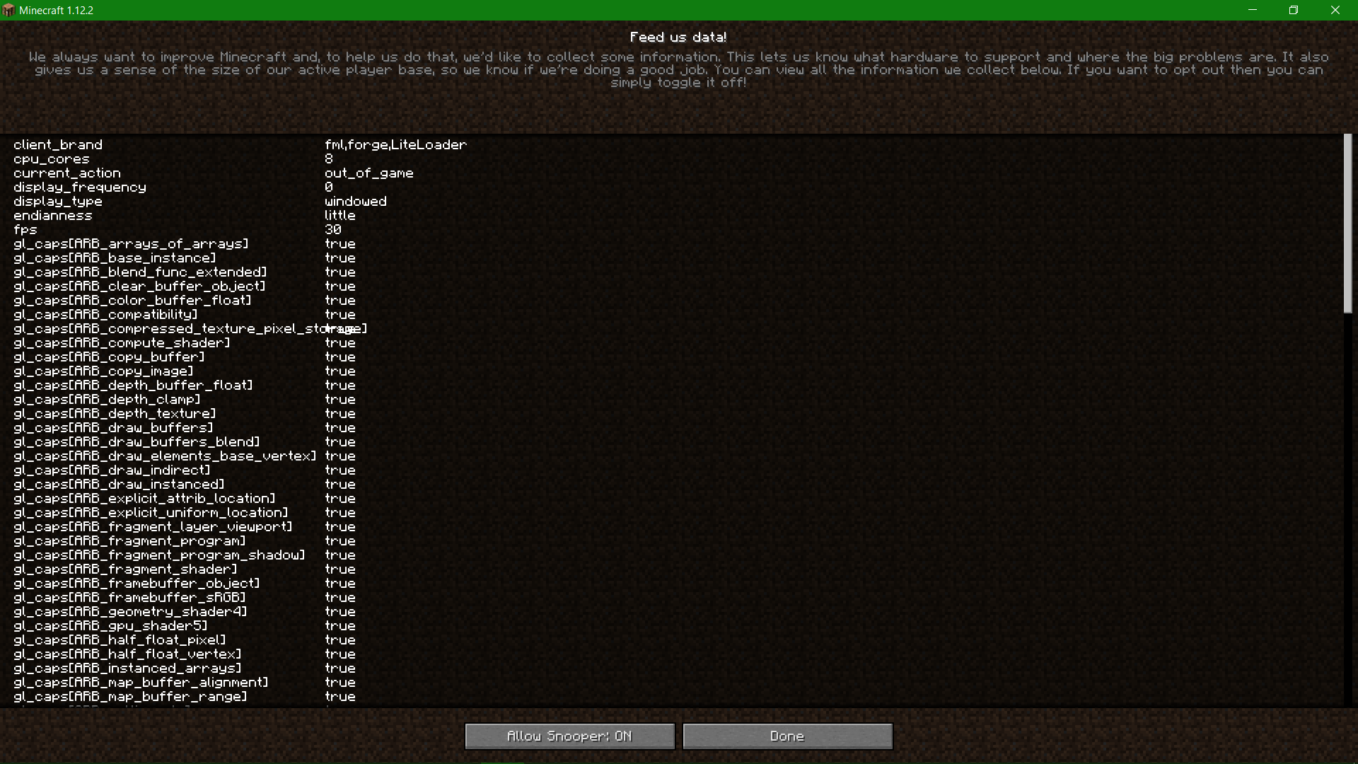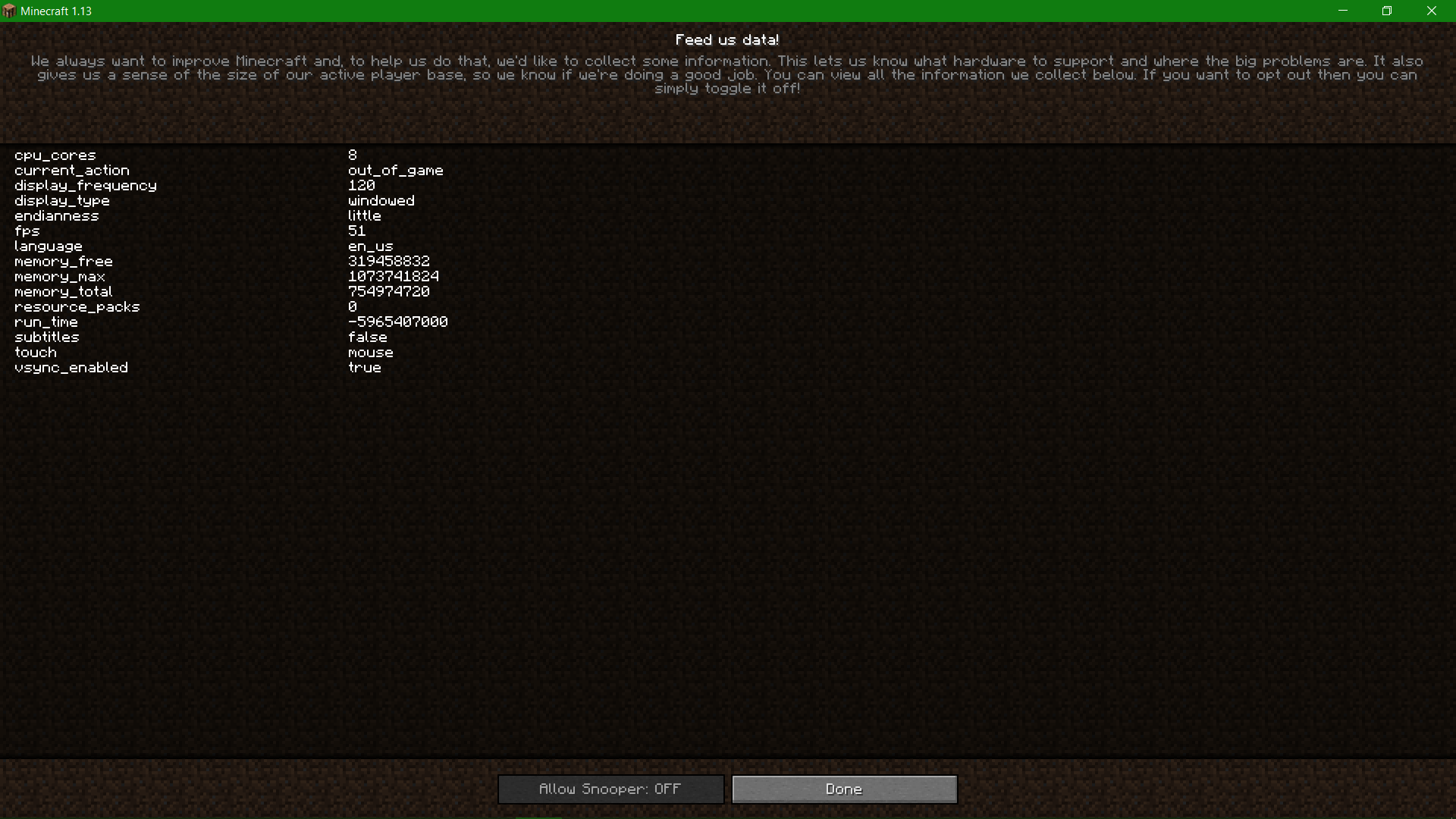 As the title says, the option to toggle the Allow Snooper is grayed out and can't be changed in MC version 1.13.
