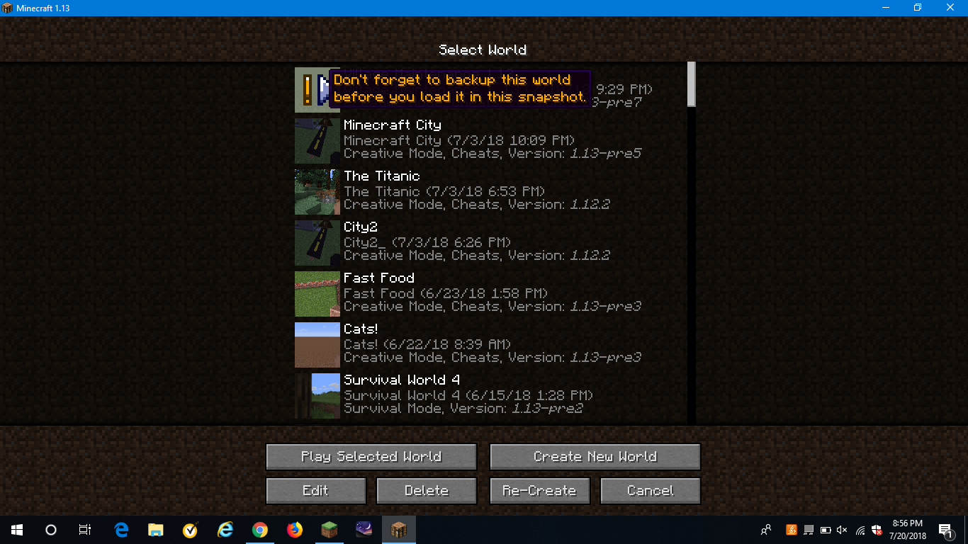 When you hover over a world it says "Don't forget to backup this world before you load it in this snapshot."