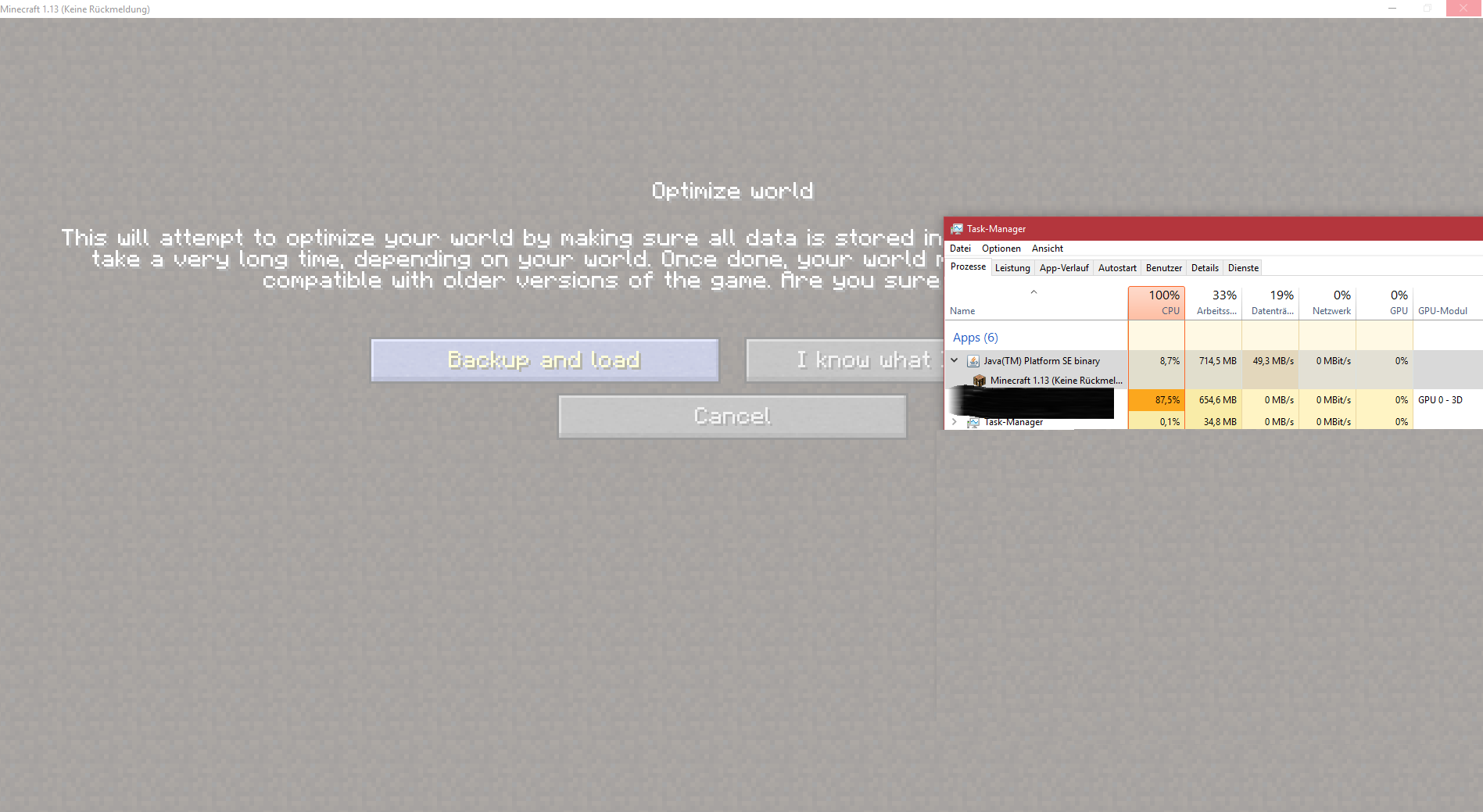 I've also uploaded a picture showcasing the problem. Yeah, my CPU is at 99%, but Minecraft had two full threads and about 10% of my CPU for this task so this shouldn't be a problem (while the OS drive and the drive Minecraft is installed on had also little work to do). The problem here seems to be (just guessing) that the backup process is being done in the same thread as the render thread instead of a worker thread.