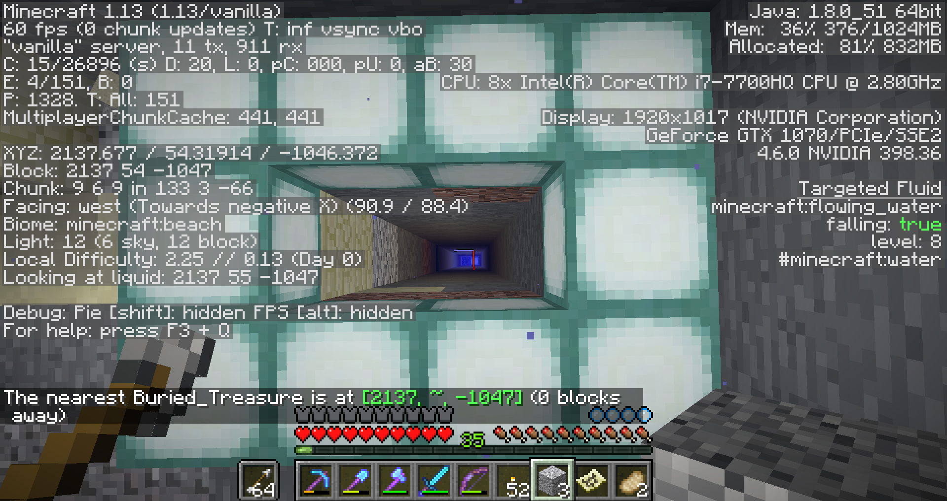 I decide to dig at the exact coordinates until bedrock, still no chest, so I take another screenshot showing F3 info as well (Buried_Treasure_Coordinates_Biome)