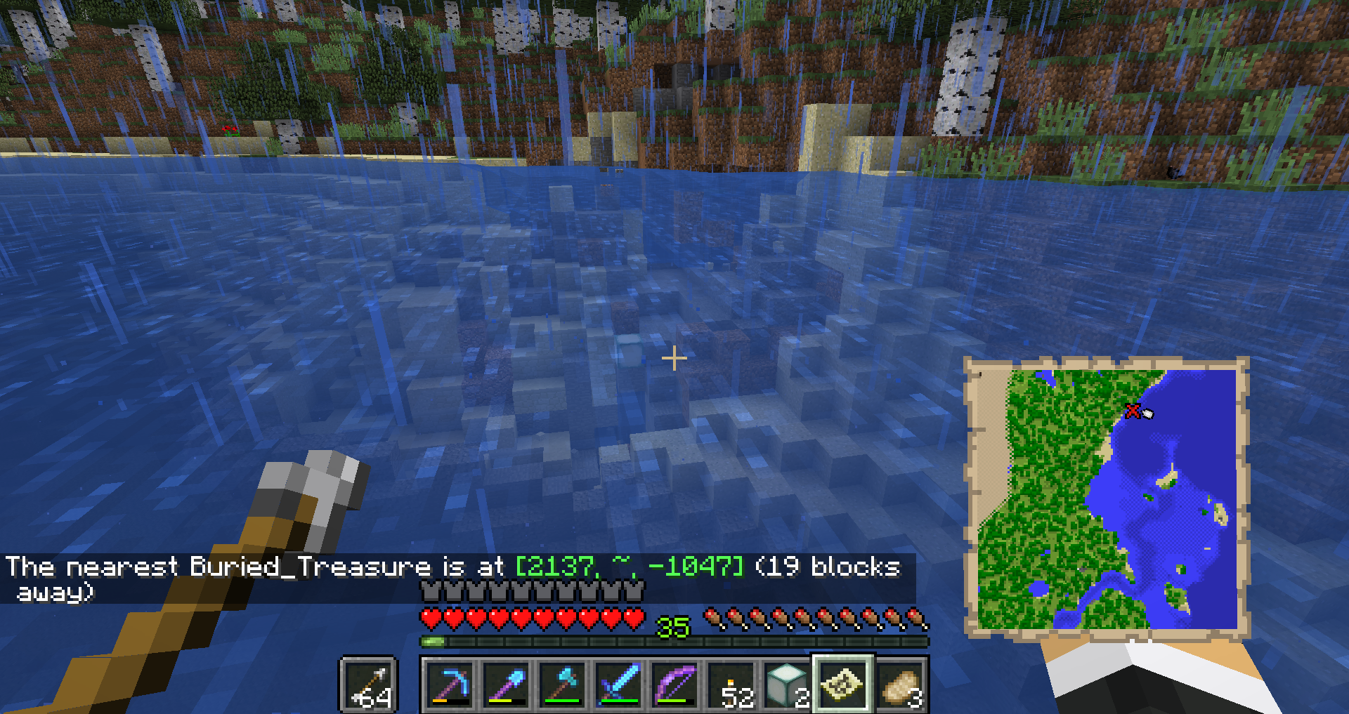 I dig around, destroy the beach for 10 min with my shovel and pickaxe, no chest appear. I take a step back and take a screenshot (Buried_Treasure_Location)