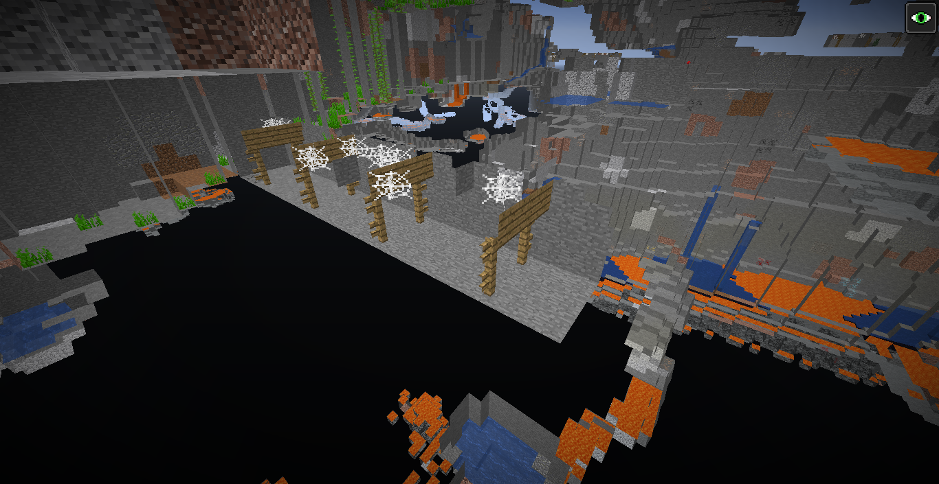 When a mineshaft generates near underwater ravines (and possibly under water caves, too), the mineshaft is fragmented and not connected to itself.