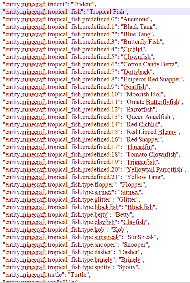 In 18w33a names were added for Tropical Fish. There are 22 names and 22 most common fish variants, but there are 3 common variants that do not use a unique name.