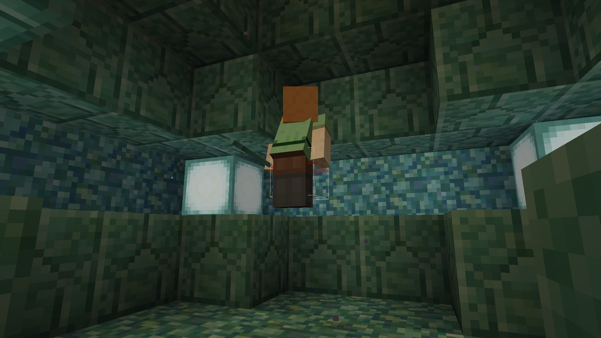 To reproduce, use a trident in various places in an ocean monument (places that have a one block space at or above your head level as shown in the screenshot are where this glitch happens most often). This bug doesn't usually cause you to suffocate, but you may have to move around in order to escape.