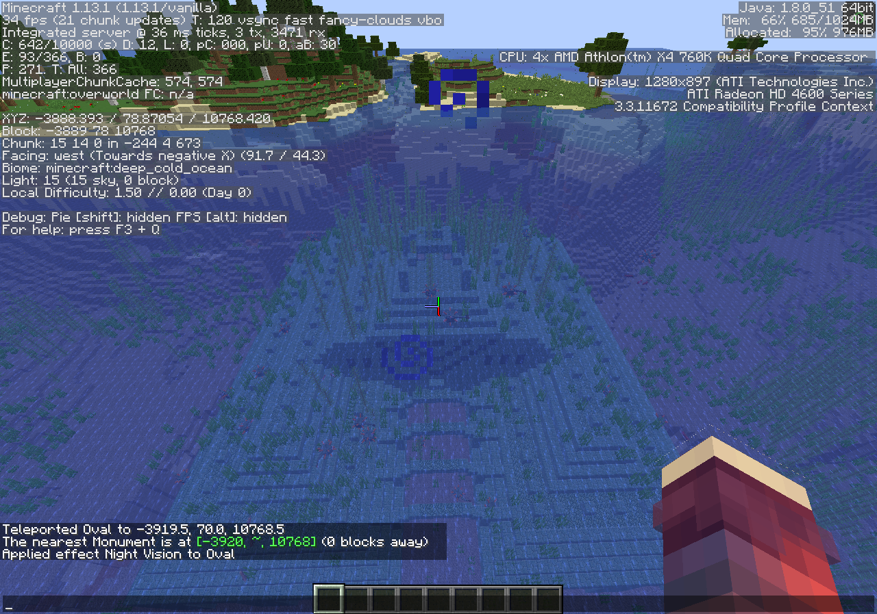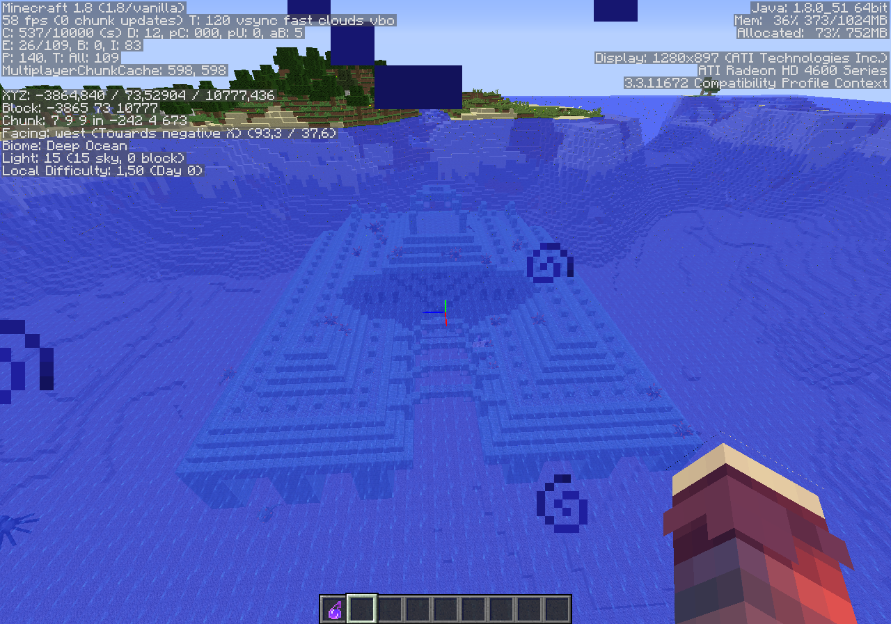 Observe how the ocean monument didn't generate, but if you type /locate Monument it will still give you coords to the monument that didn't generate.