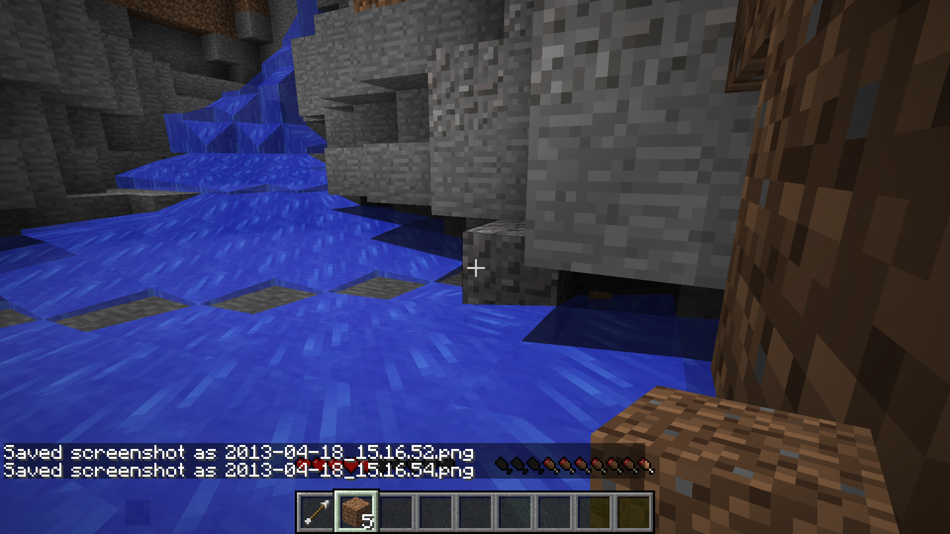 While in survival I was riding a waterfall down, and a simple dirt block was in the way at head level, so I went to break it after I had came to rest against it. It didn't fully break and started the breaking process over. After this happened about three times I slid into it and it reformed again, essentially suffocating me in it.