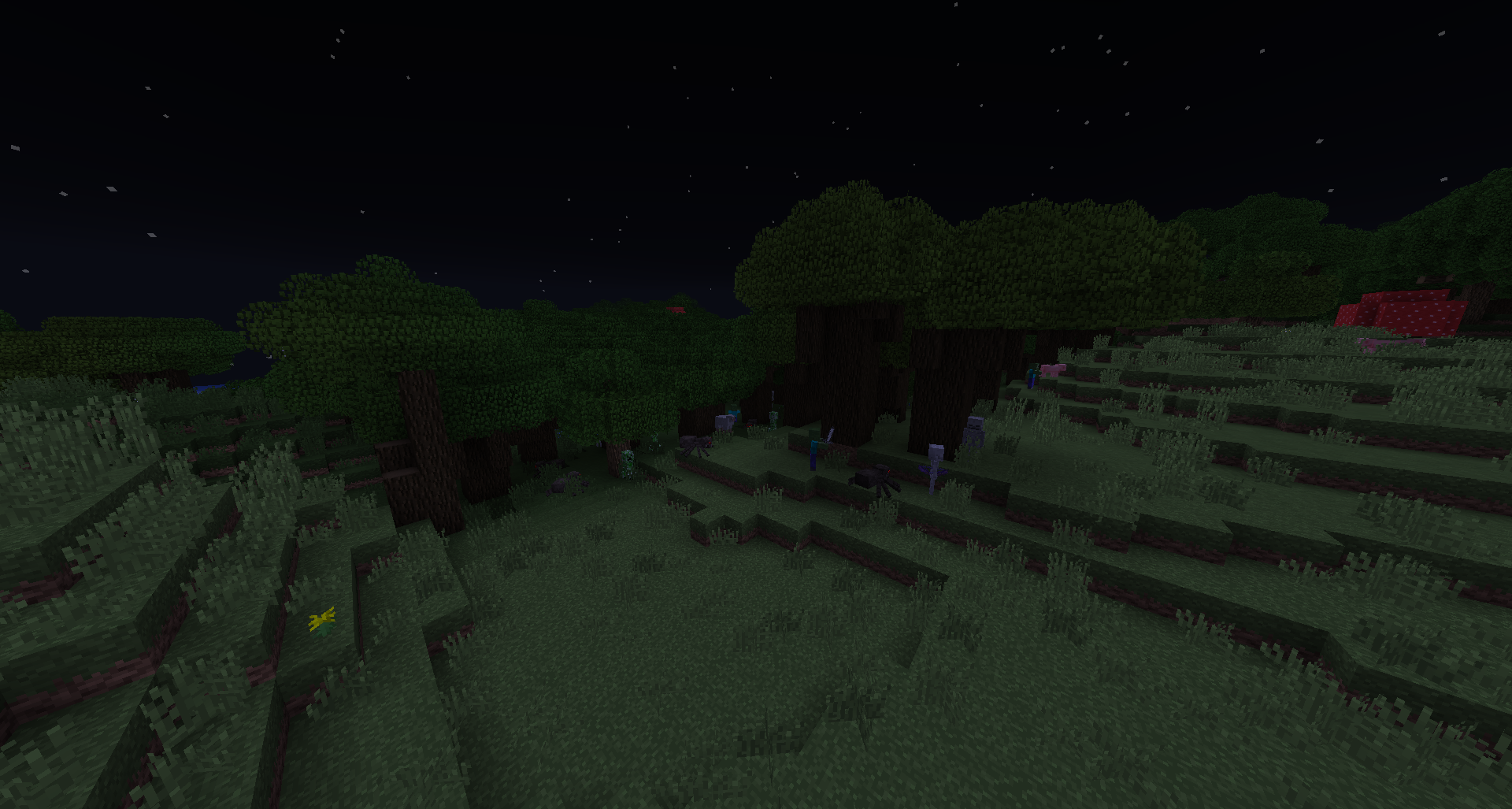 I flew over to the dark oak forest surrounding my base (Loaded in 1.13) to find it overflowing with mobs.