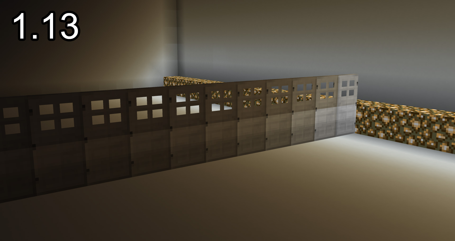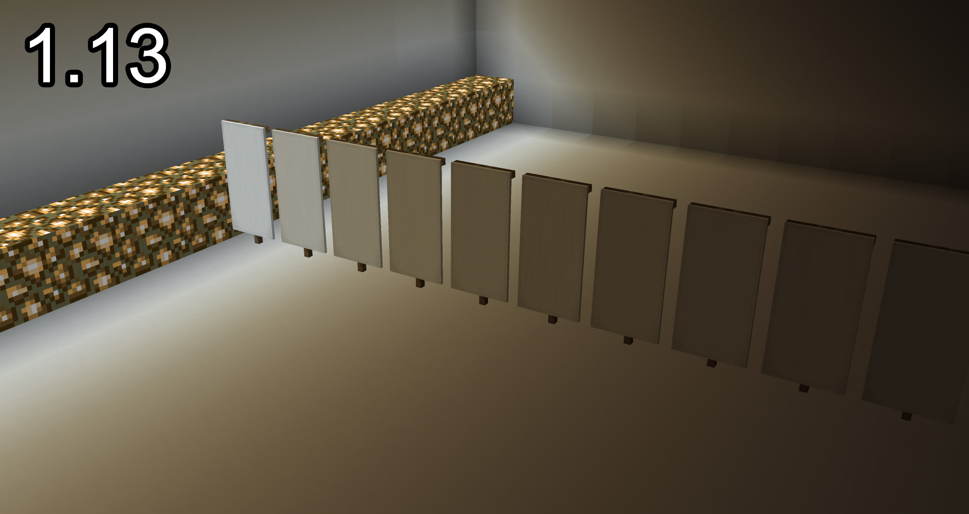 Lighting in 1.13 onward appears darker than it appeared in 1.12 and previous versions on doors, beds, banners, and possibly other blocks. It's as though the light begins to falloff sooner than it did in version 1.12, and a yellow tint can be easily seen on some blocks, even in daylight.