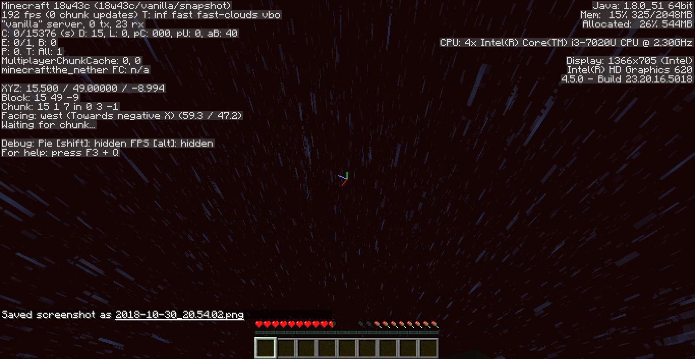 When entering the Nether on a server with one other friend on it, all that showed was the Nether's void color and rain. I soon crashed, and upon logging back on was met with enormous lag as the Nether loaded.
