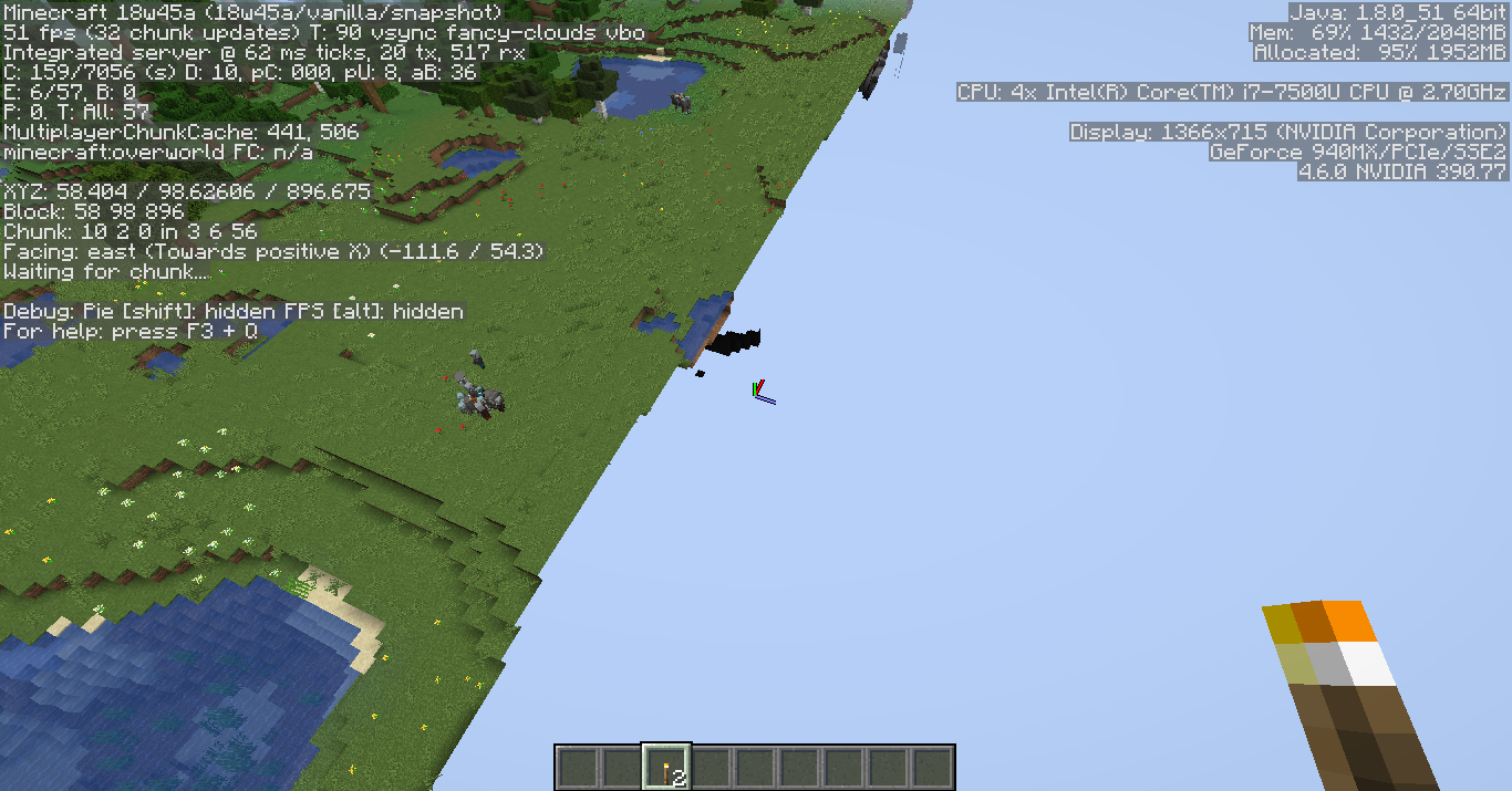 In some places (mostly oak forests) Minecraft has lots of trouble rendering the terrain, and it does not do this in any other version, including a previous snapshot I tried (18w43b). This happens in all worlds and tweaking the video settings has no effect on it.