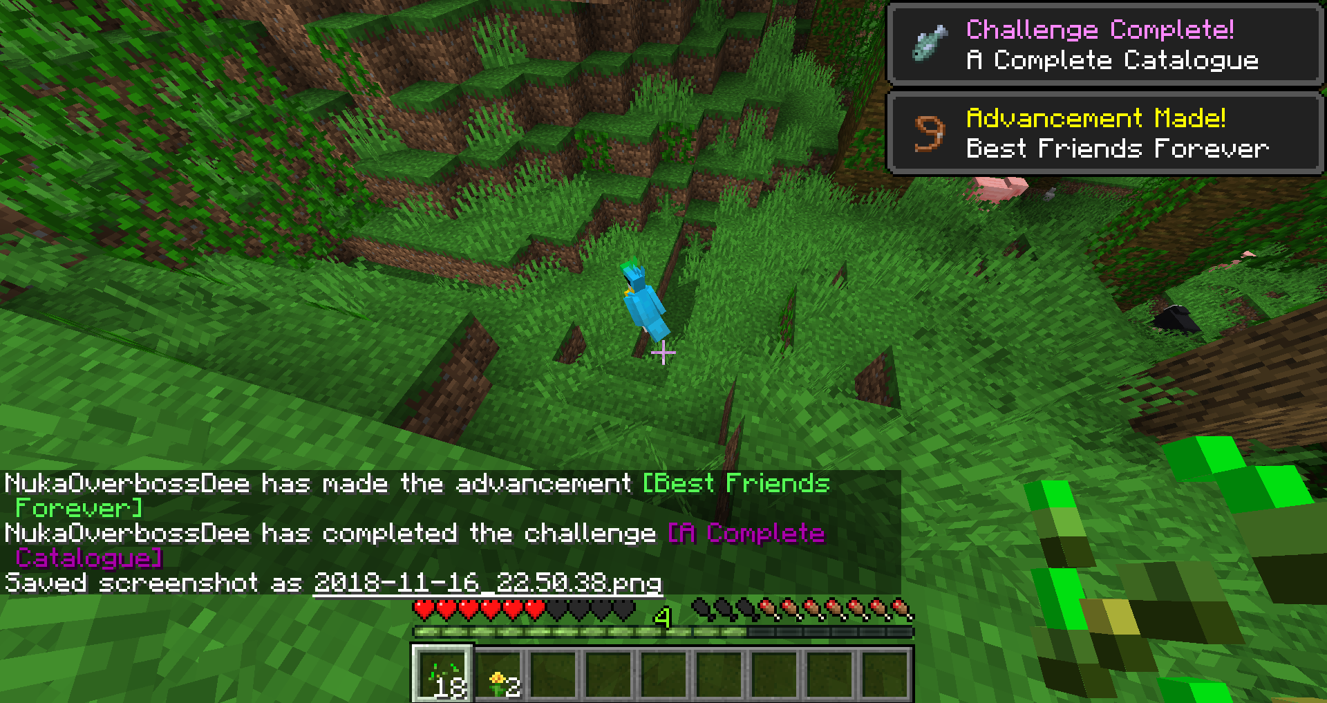 Tamed a parrot and it triggered both the "Best Friends Forever" achievement and the "A Complete Catalogue" challenge. I was able to recreate this issue 4 times in brand new world saves.