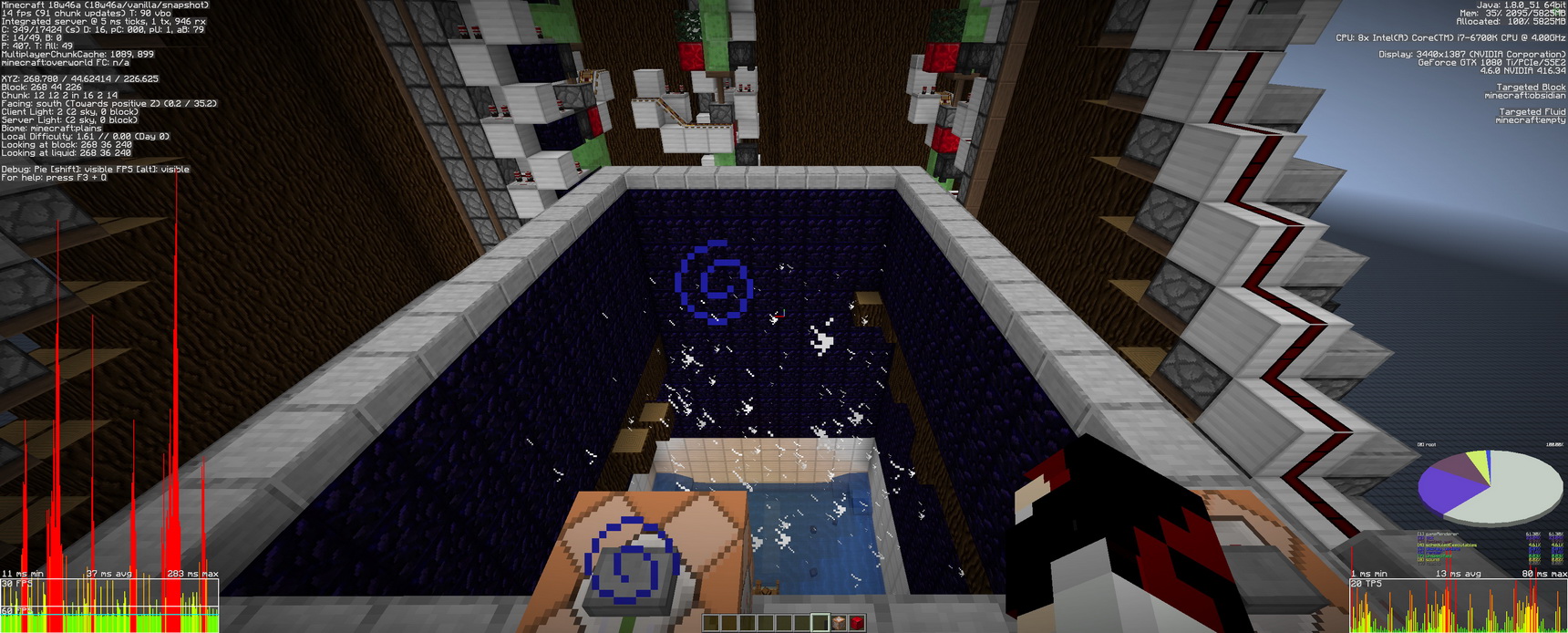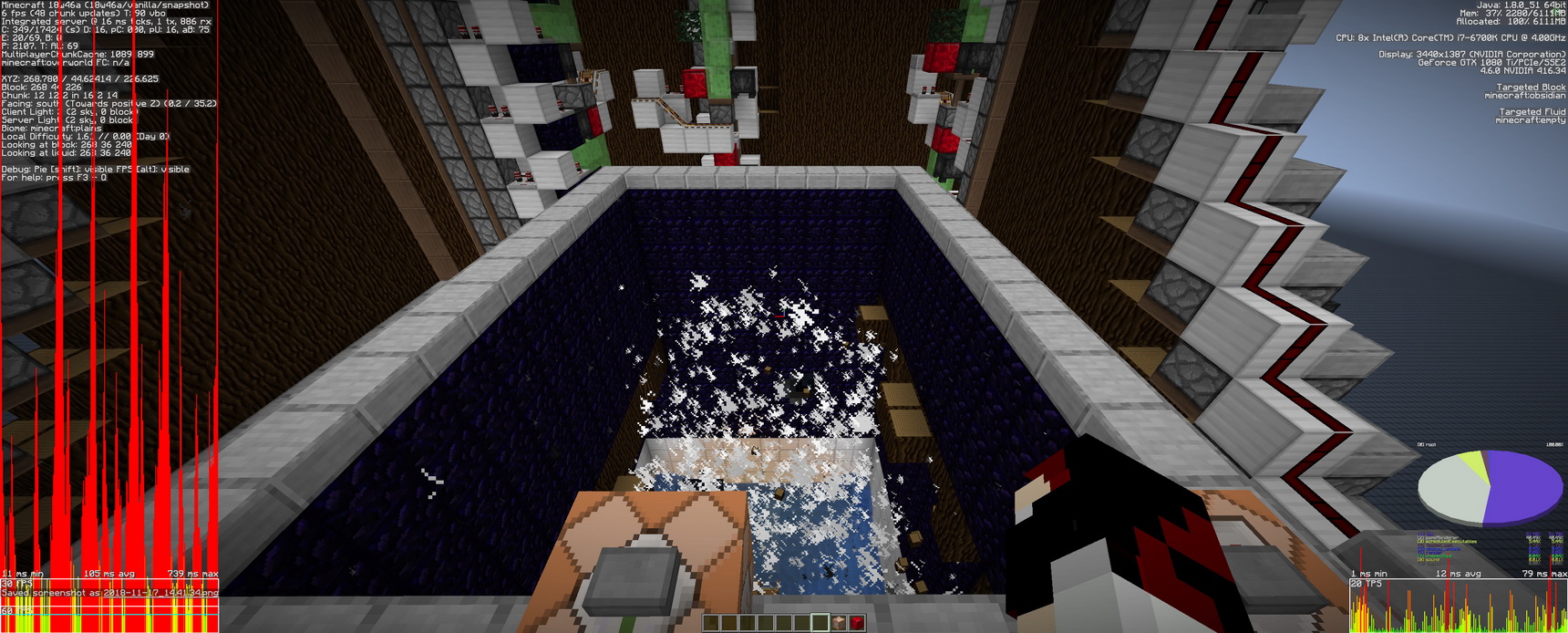 Up from the version Minecraft 1.13 the game render starts to wear down over time. I noticed this bug first under heavy redstone/block/item activity. I recently used an older redstone contraption of mine what was designed by Ilmango (TNT Efficent 2x2 Spruce tree farm). It's basicly a big sawmill to produce wood.