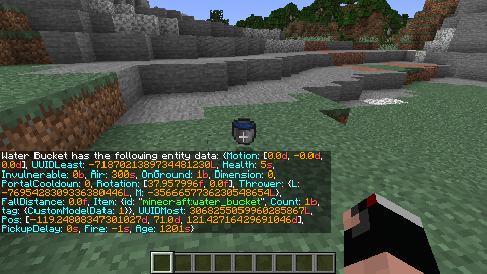 Use the following command to give yourself a water bucket with CustomModelData: