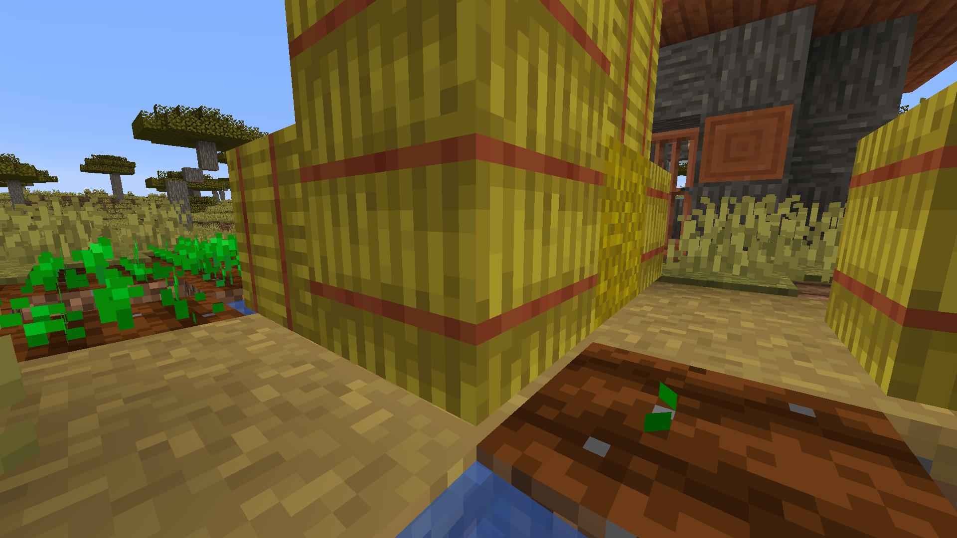 Coordinates: /execute in minecraft:overworld run tp @s 135 66 38Type of Block: Melon and Haybales