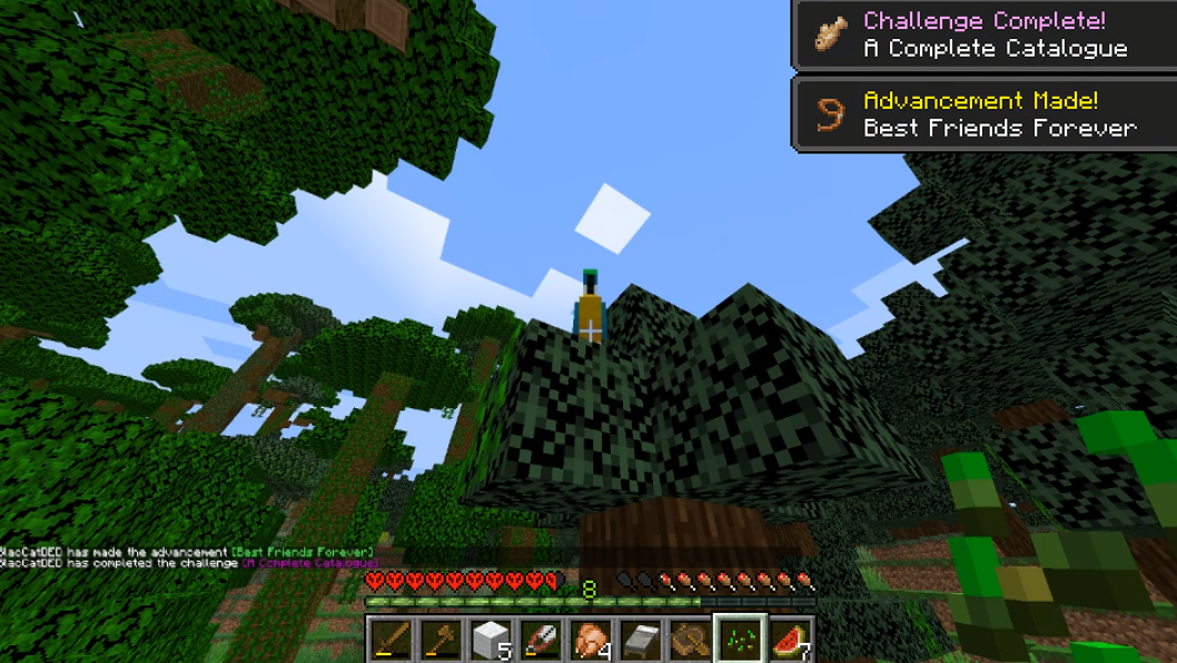 I had just started a game in the latest snapshot, 18w50a, and had gone on a hunt to find a jungle. I found a jungle and parrots, got somes seeds, and tamed one of the parents. Right as I tamed the parrot, I got the Best Friends Forever achievement (As normal) and the A Complete Catalogue challenge (NOT as normal).