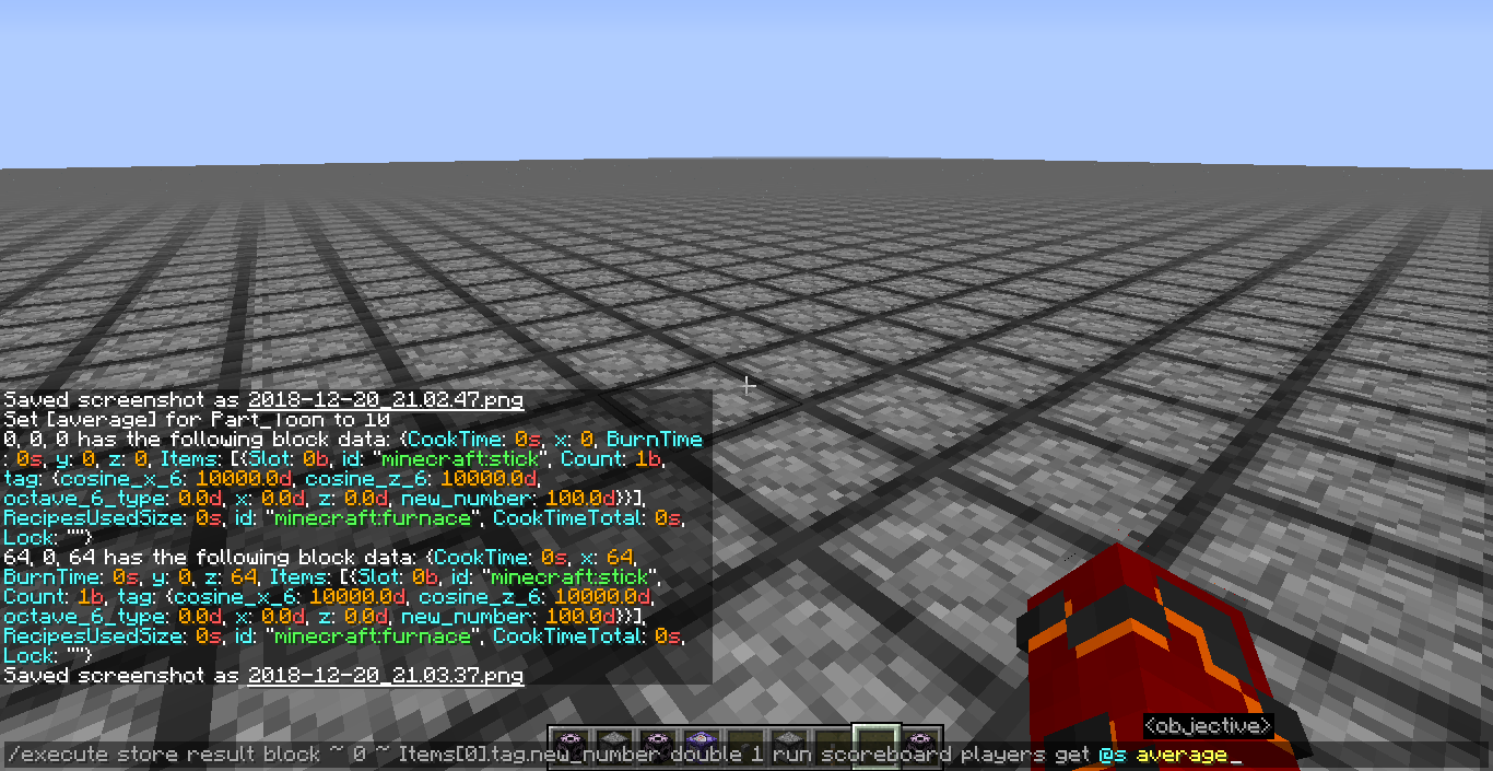 I then execute the command "/execute store result block ~ 0 ~ Items[0].tag.new_number double 1 run scoreboard players get @s average" in "phantom_bug_3.png" to set the "new_number" tag at 0 0 0 to 10d, the new value of "average."