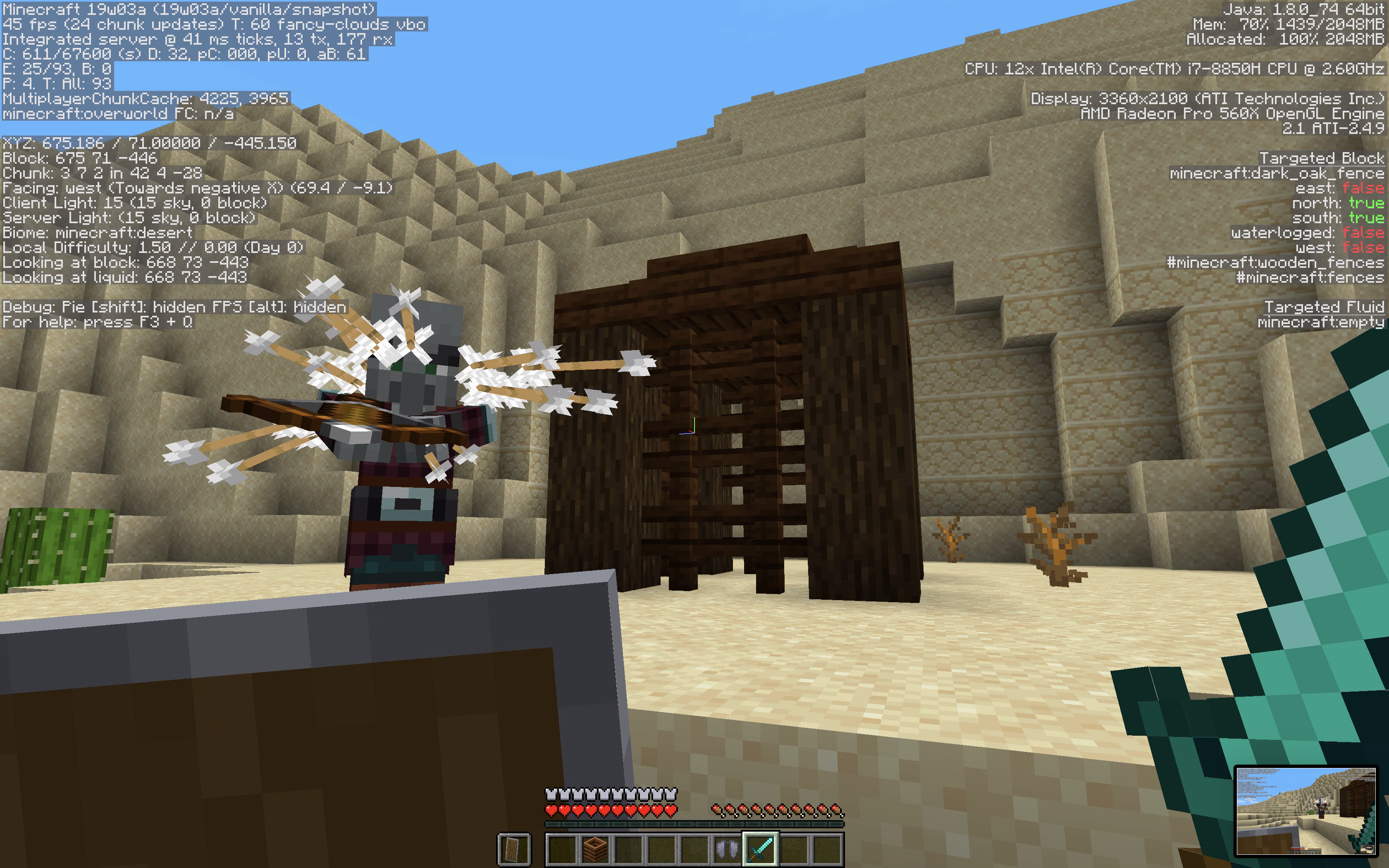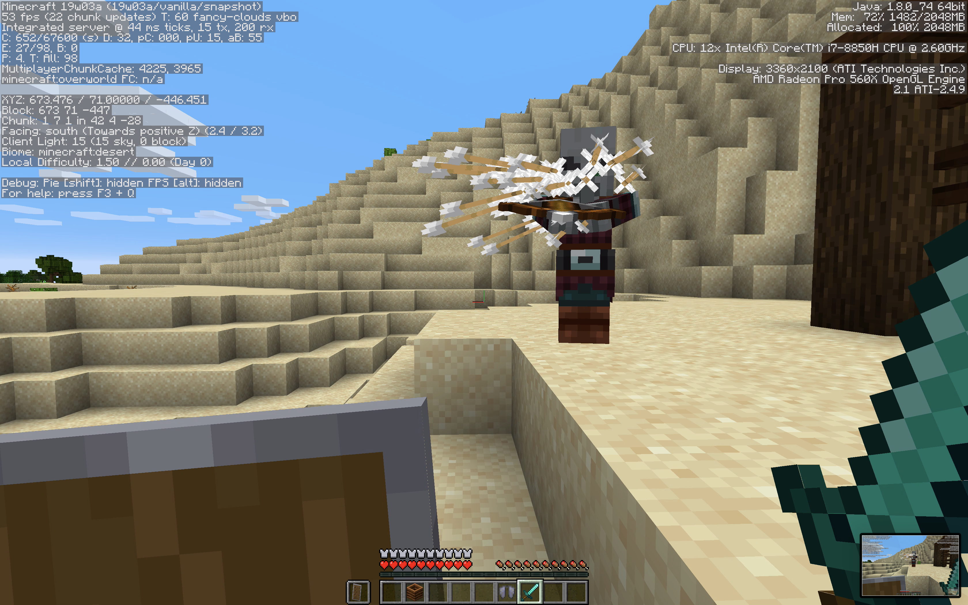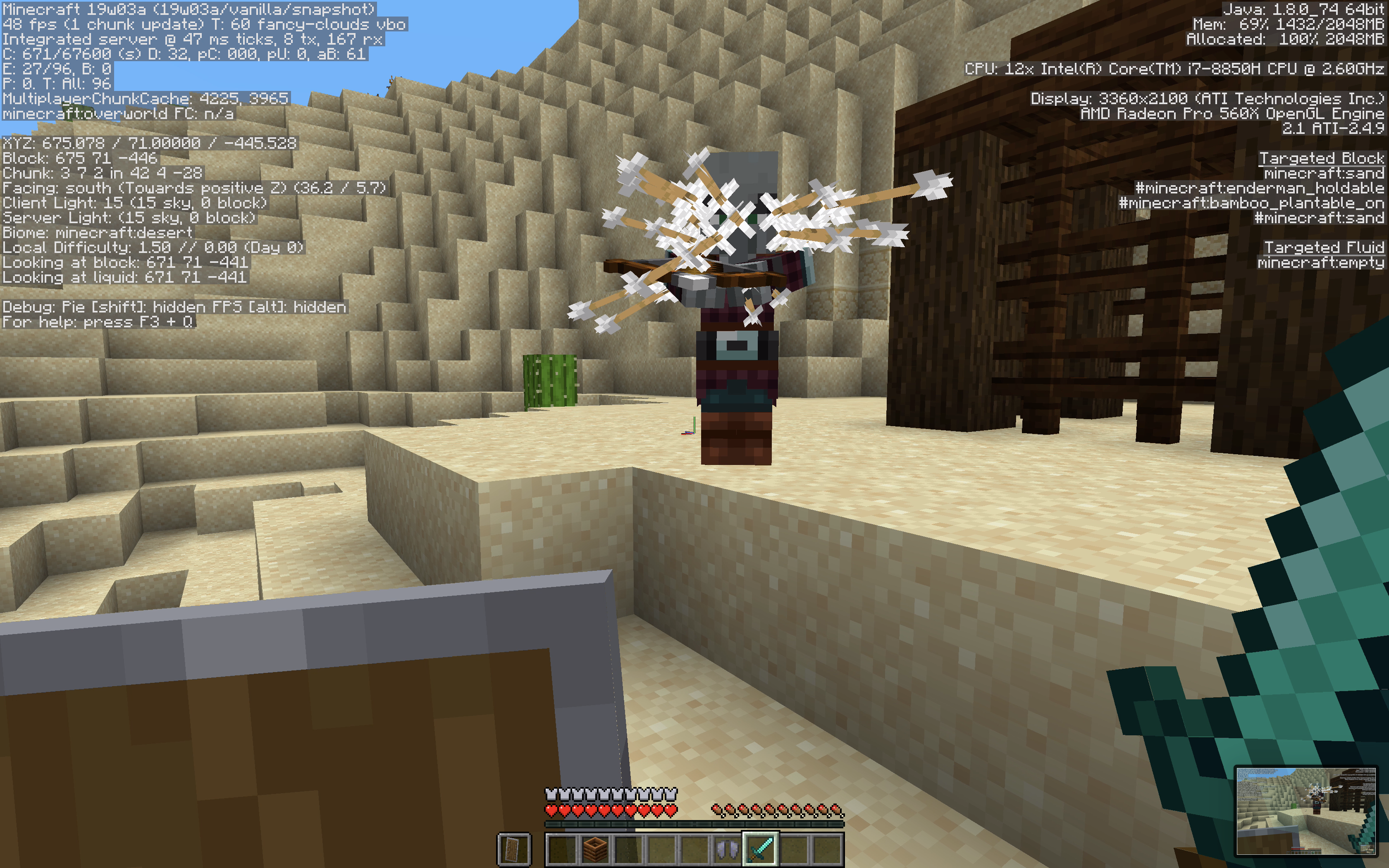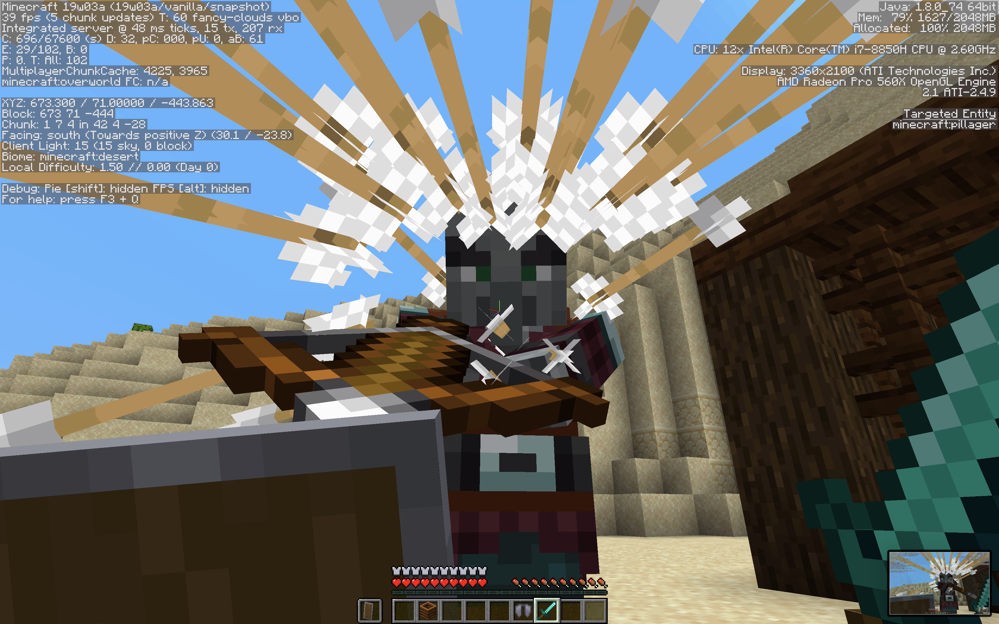 Switched from creative to survival, wearing diamond armor, pillagers fire arrows with crossbow at player, but the arrows freeze during flight. I will take damage if I stand close enough to pillager.