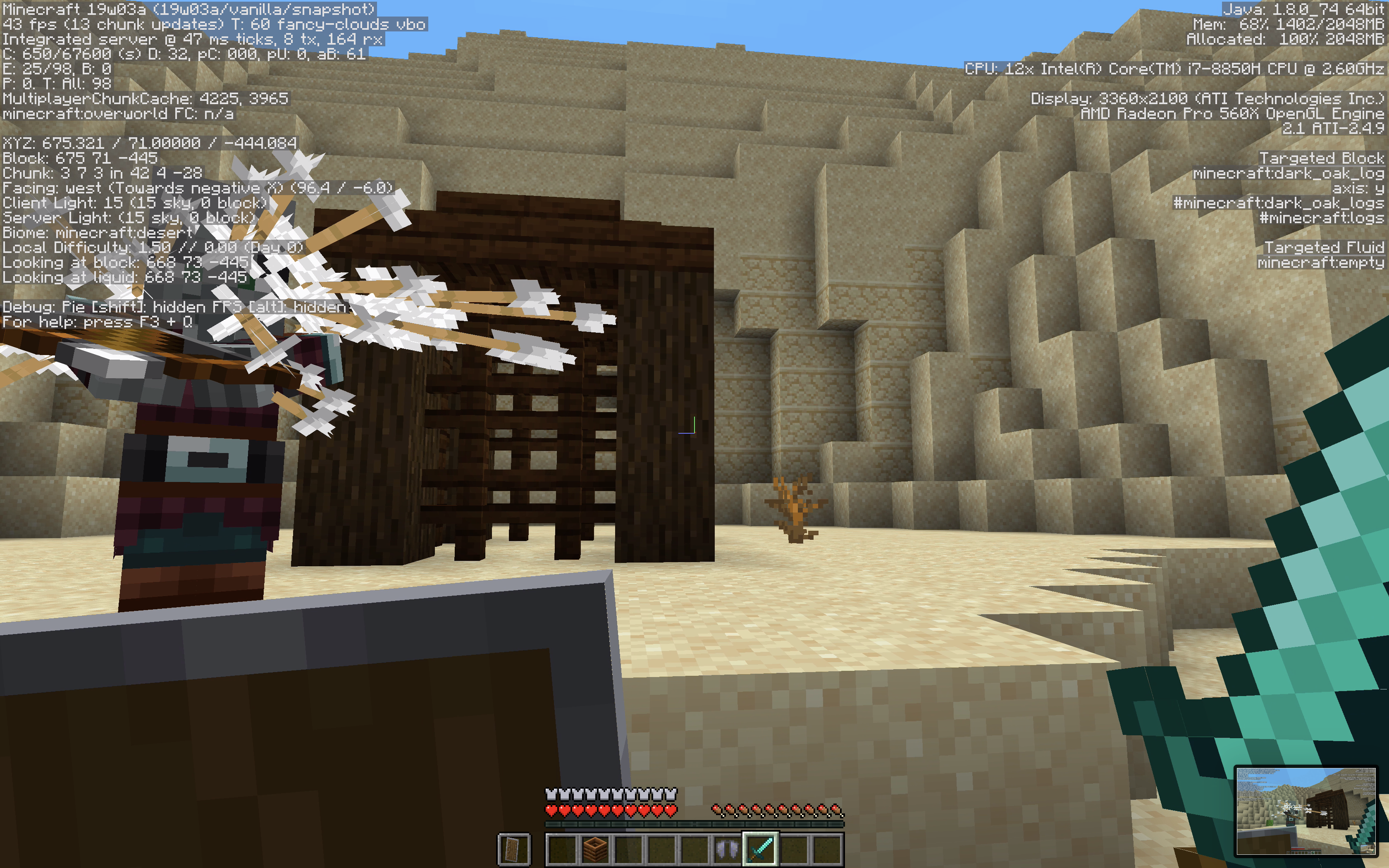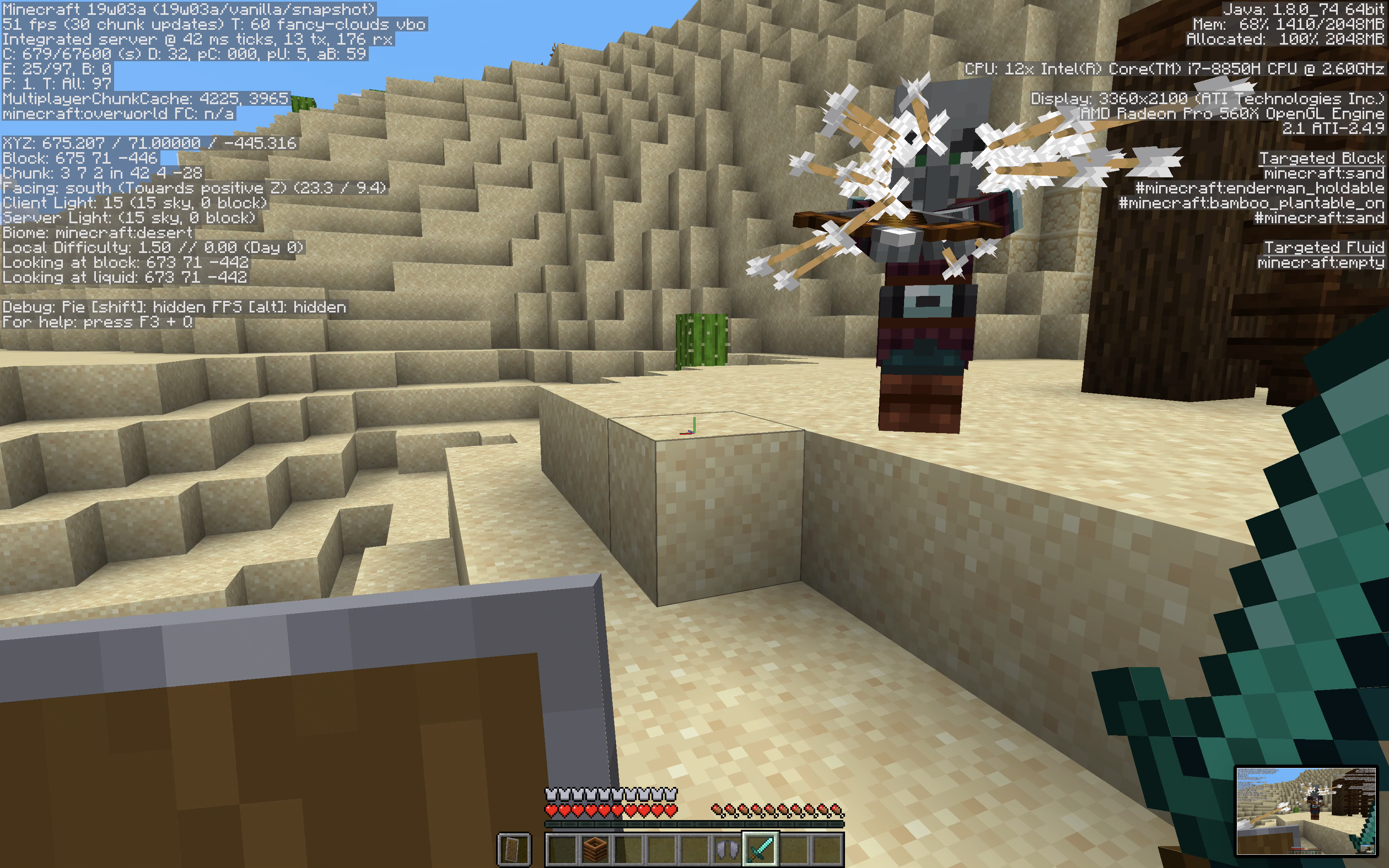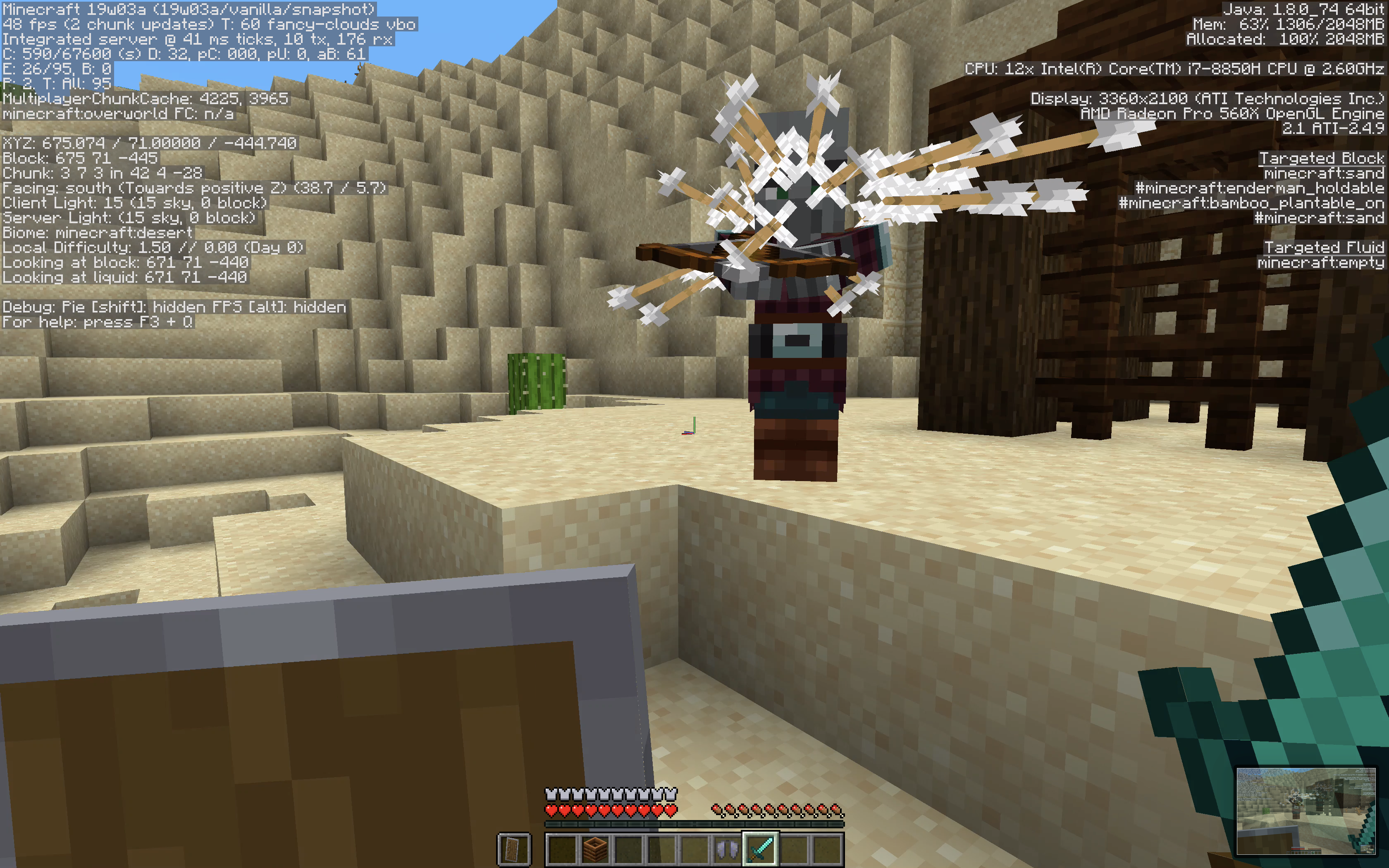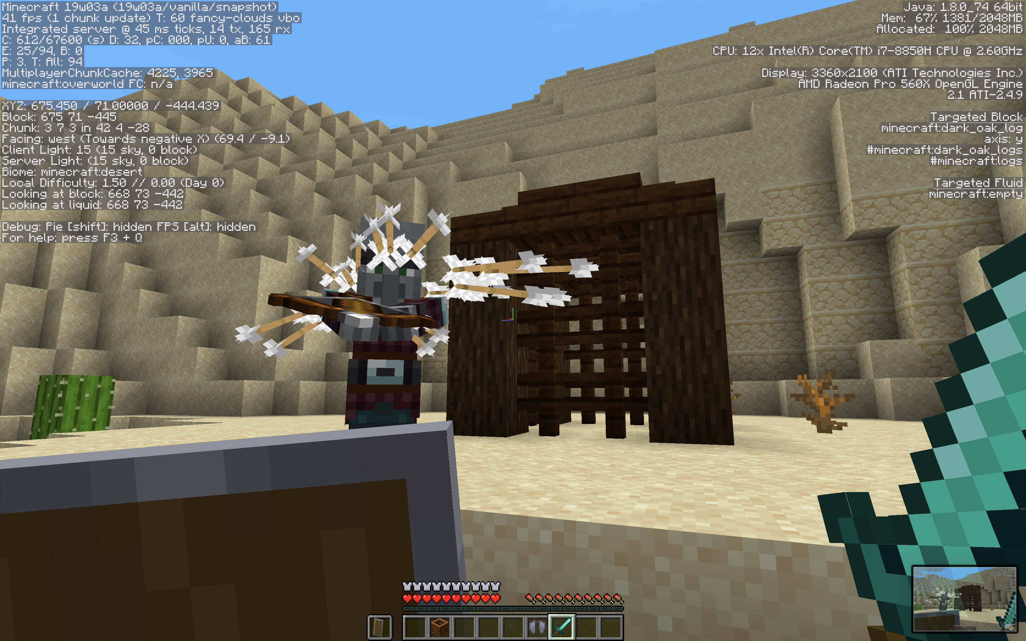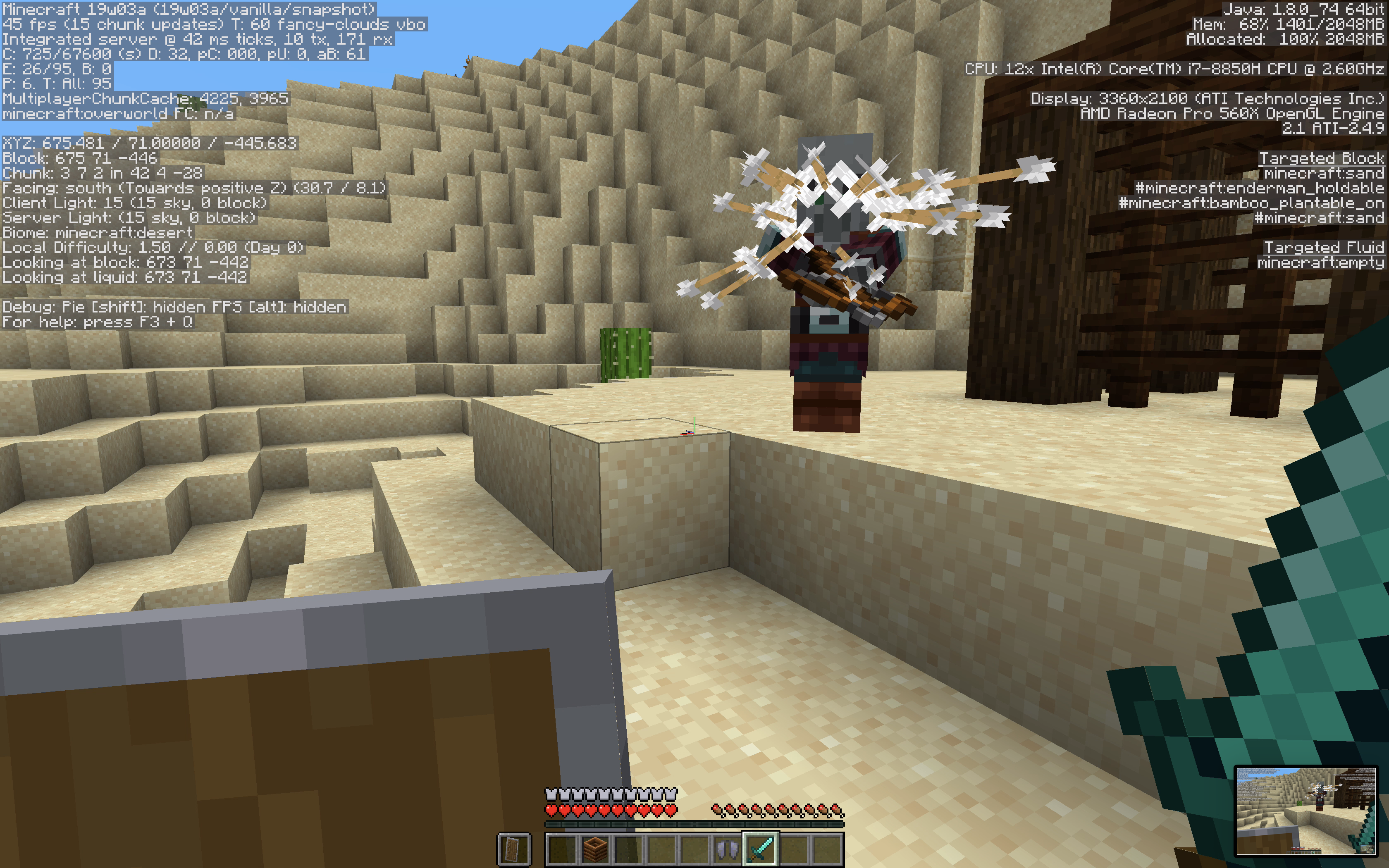 Switched from creative to survival, wearing diamond armor, pillagers fire arrows with crossbow at player, but the arrows freeze during flight. I will take damage if I stand close enough to pillager.
