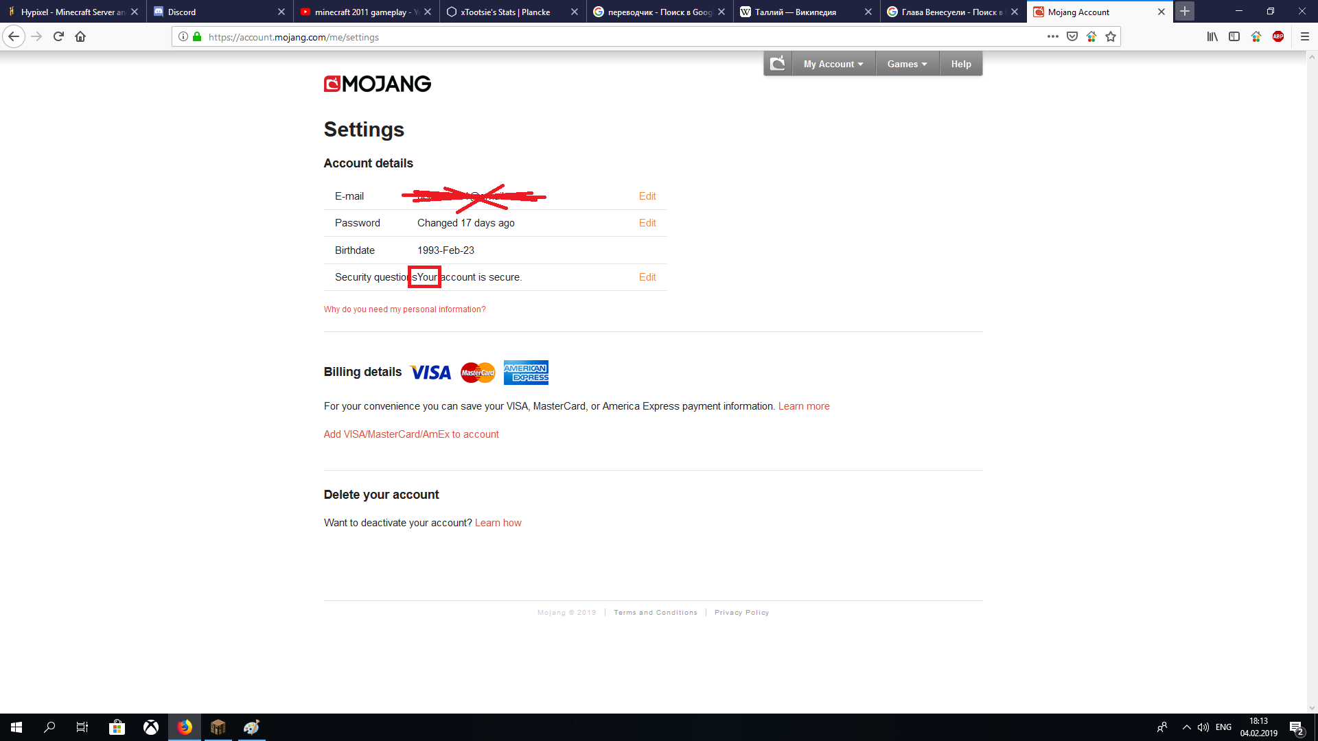 Look on the screen, Security questions and Your account is in secure typed together.