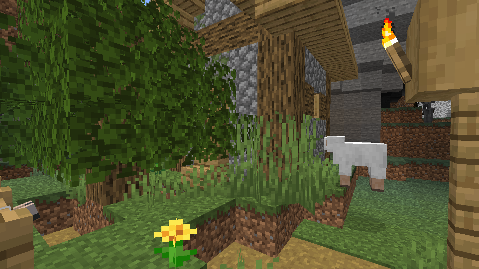 There was also some of the terrain that was supposed to be "overwritten" by the village left over in places it seemed it shouldn't have. For example, one house had a few dirt blocks inside, and there was a tree surrounded by ordinary grass blocks right in the middle of a street, right in front of a house, trapping the villagers inside. There was also a tree in front of a fence gate, preventing entry to a pig pen.