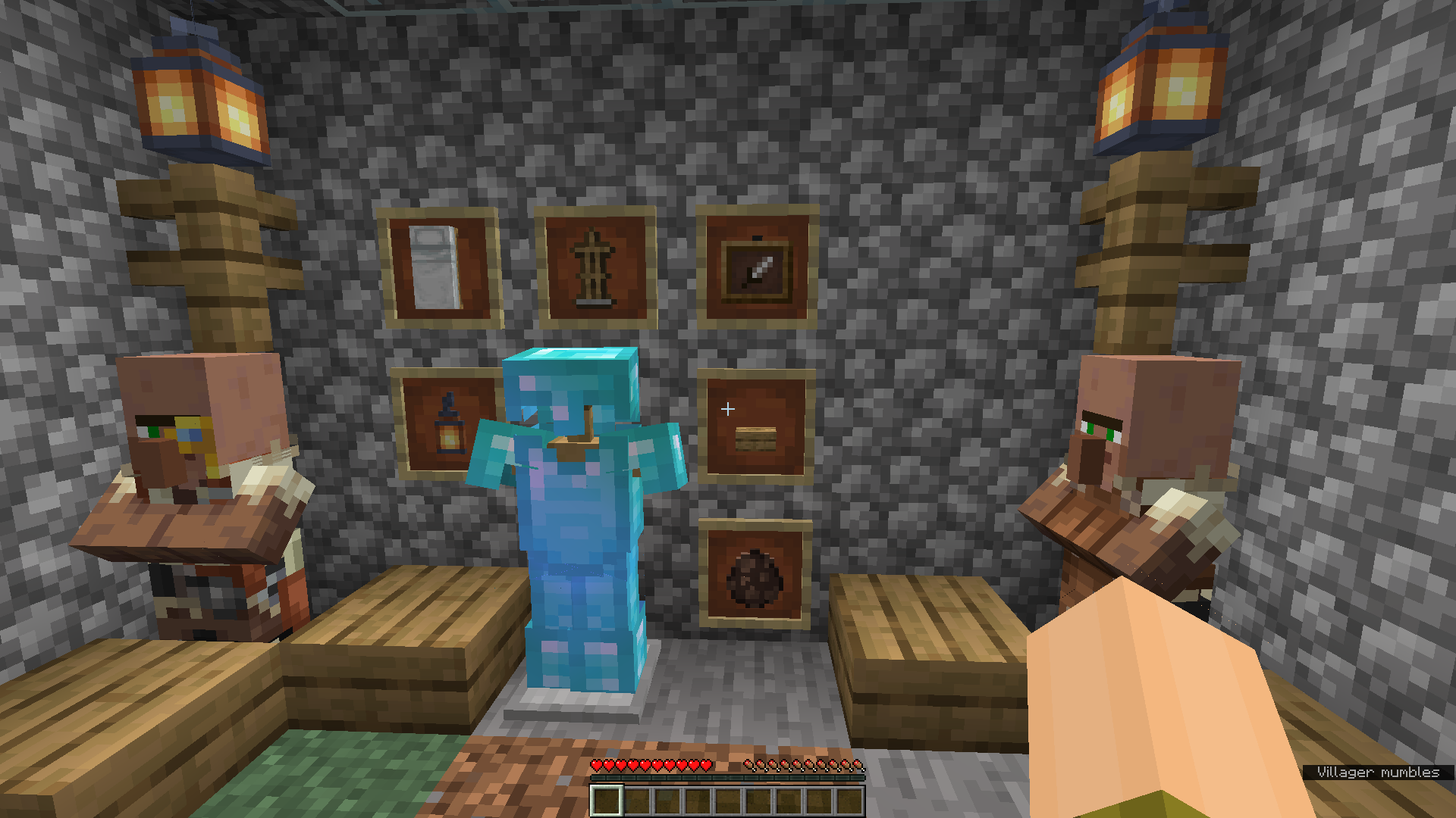 Within and along one of the interior walls, place item frames with objects, an armor stand with armor, and villagers