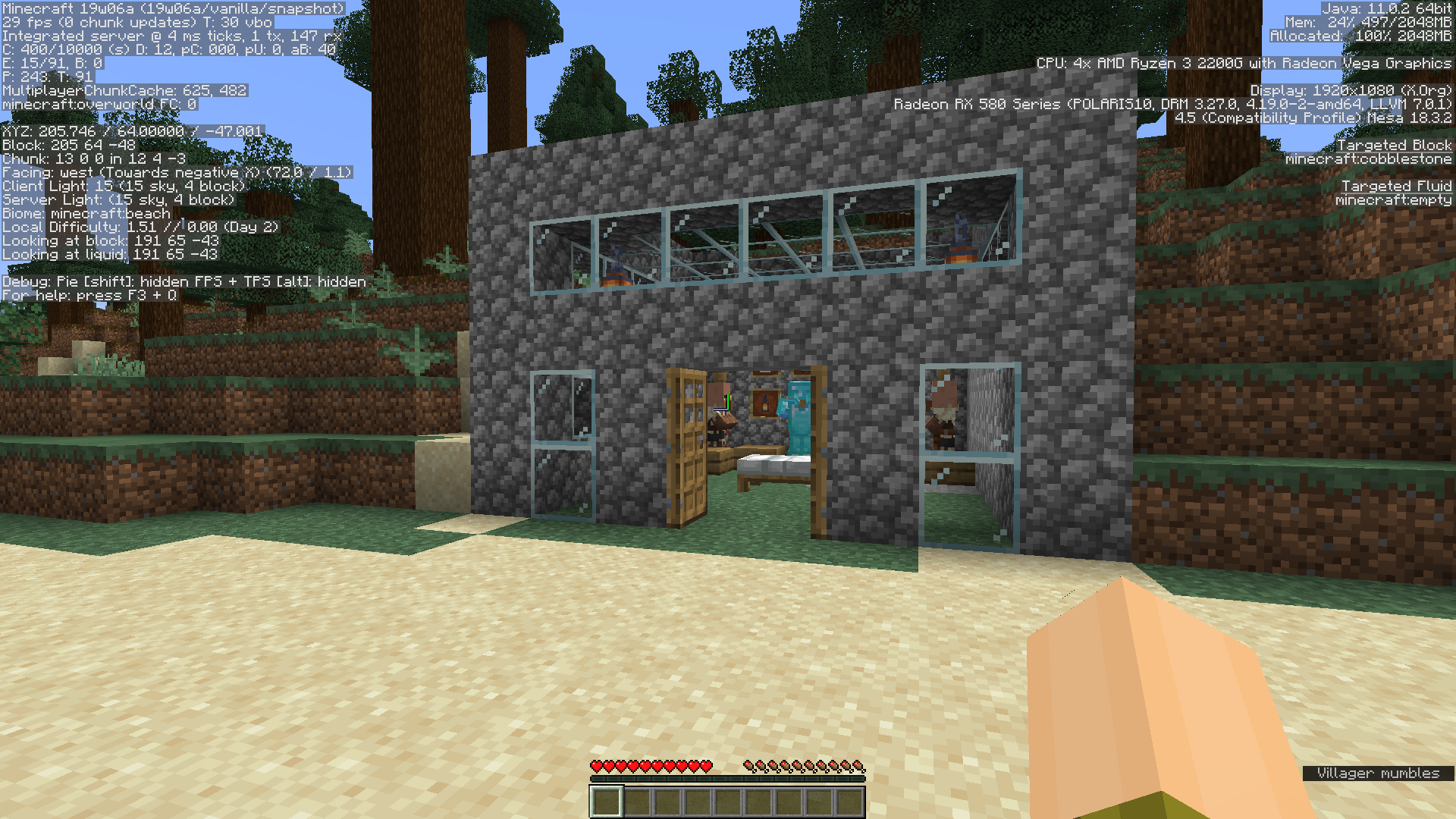 Attachment 2019-02-09_13.04.27.png shows the state of the objects and villagers after reentry to the bed spawn from the End.