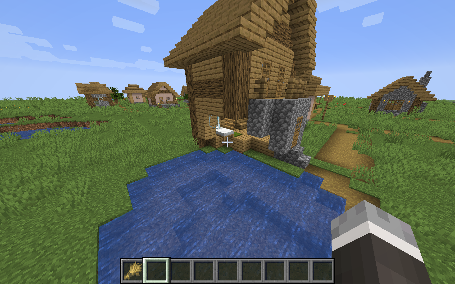 This tall village house next to a lake in a superflat world seems to have generated without part of its wall. This could be due to the generation of the lake.
