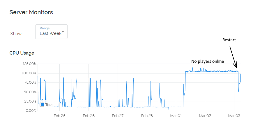 Our minecraft server is running slowly and using 100% CPU, even when no players are online.