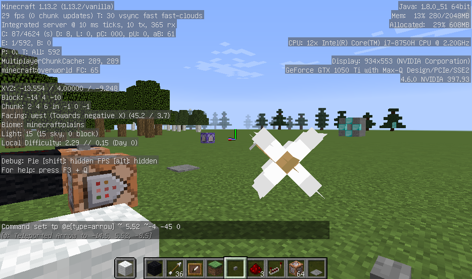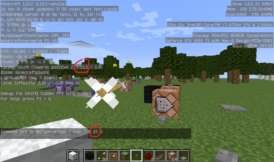 The attached four experimental screenshots will show how the arrow's rotational coordinates differ from the command block input as well as the rotational coordinates of the player.