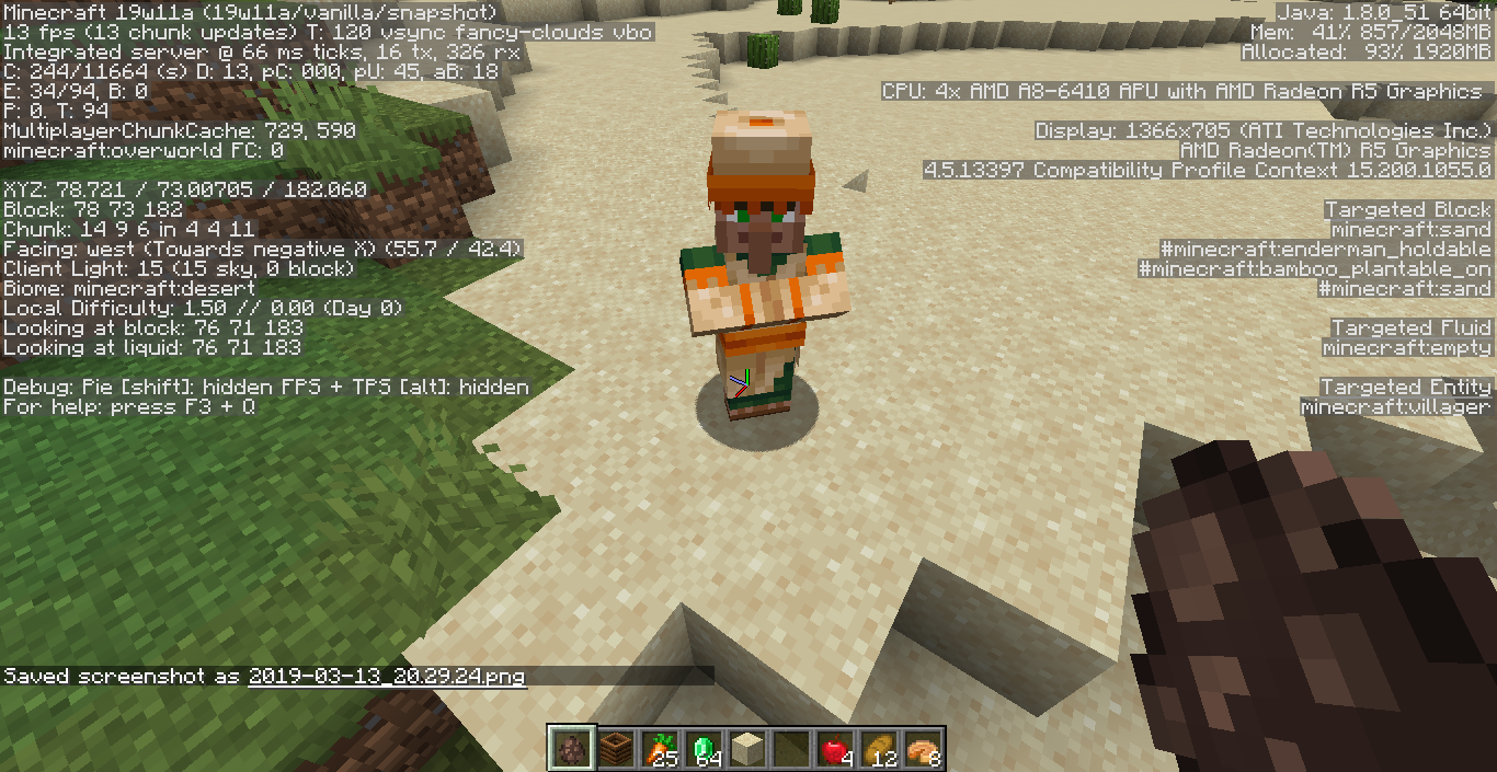 As shown below, I excitedly went to the nearest village to check mechanics. After being dissappointed that villagers spawned in composters won't become farmers until 3 mins later, I went over to the nearby forest biome to see if I spawned a villager there if it would join the desert village. I ended up with a brown coat.