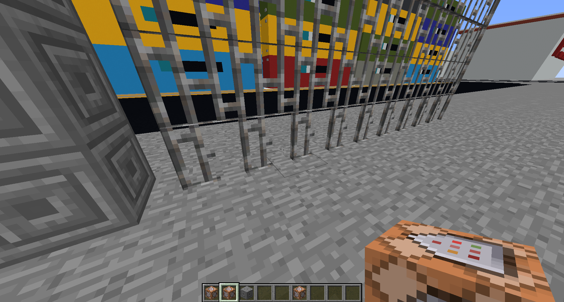 Place command block> go into command block UI> Enter(For Example) /fill ~ ~ ~ ~ ~5 ~ iron_bars > click conditional> lick Always active> click done> middle click block to get the +NBT> place block,