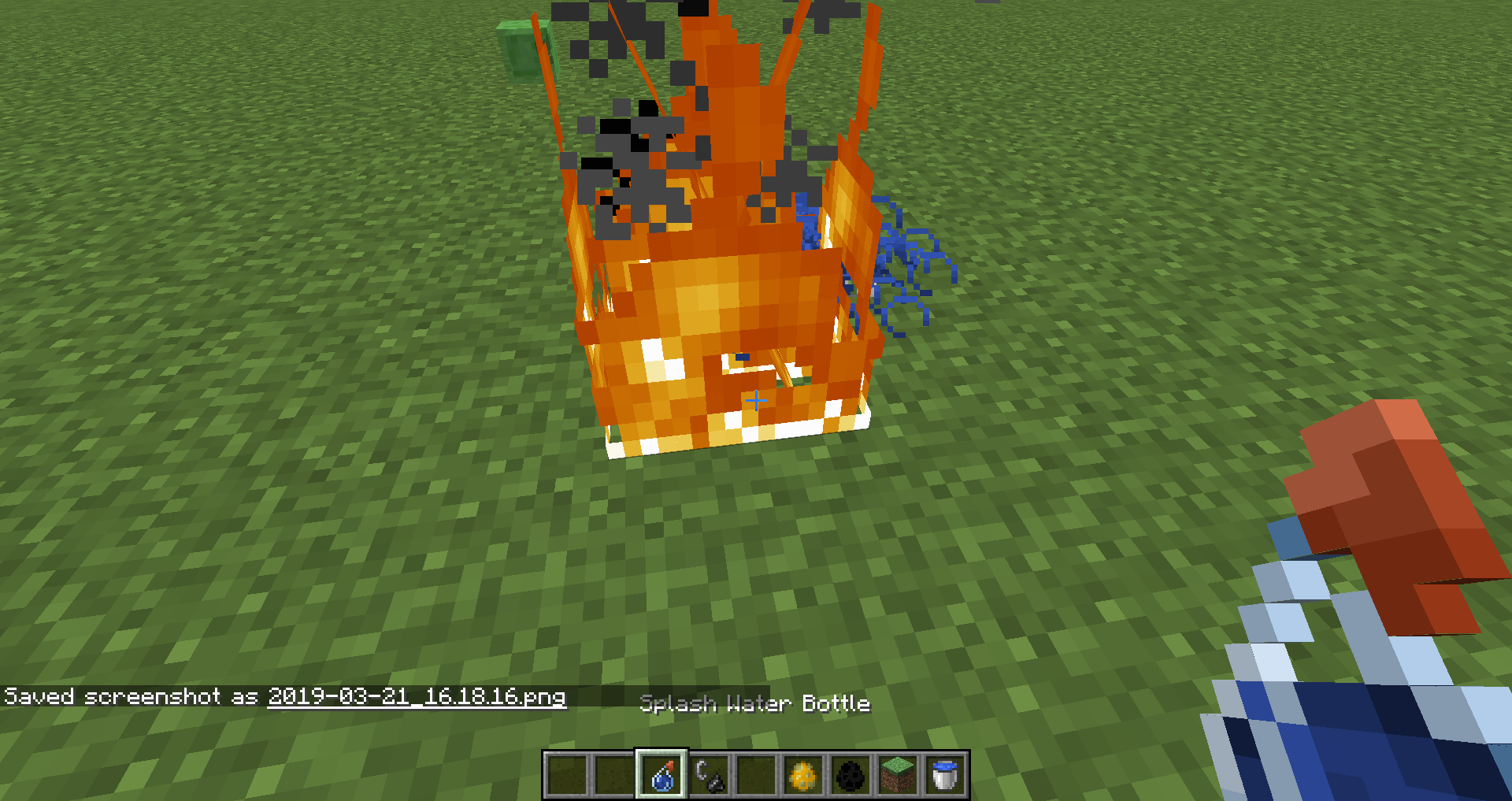 "Splash water bottles will have no effect on almost all entities, but will put out fire in the block hit and the four blocks horizontally surrounding it."
