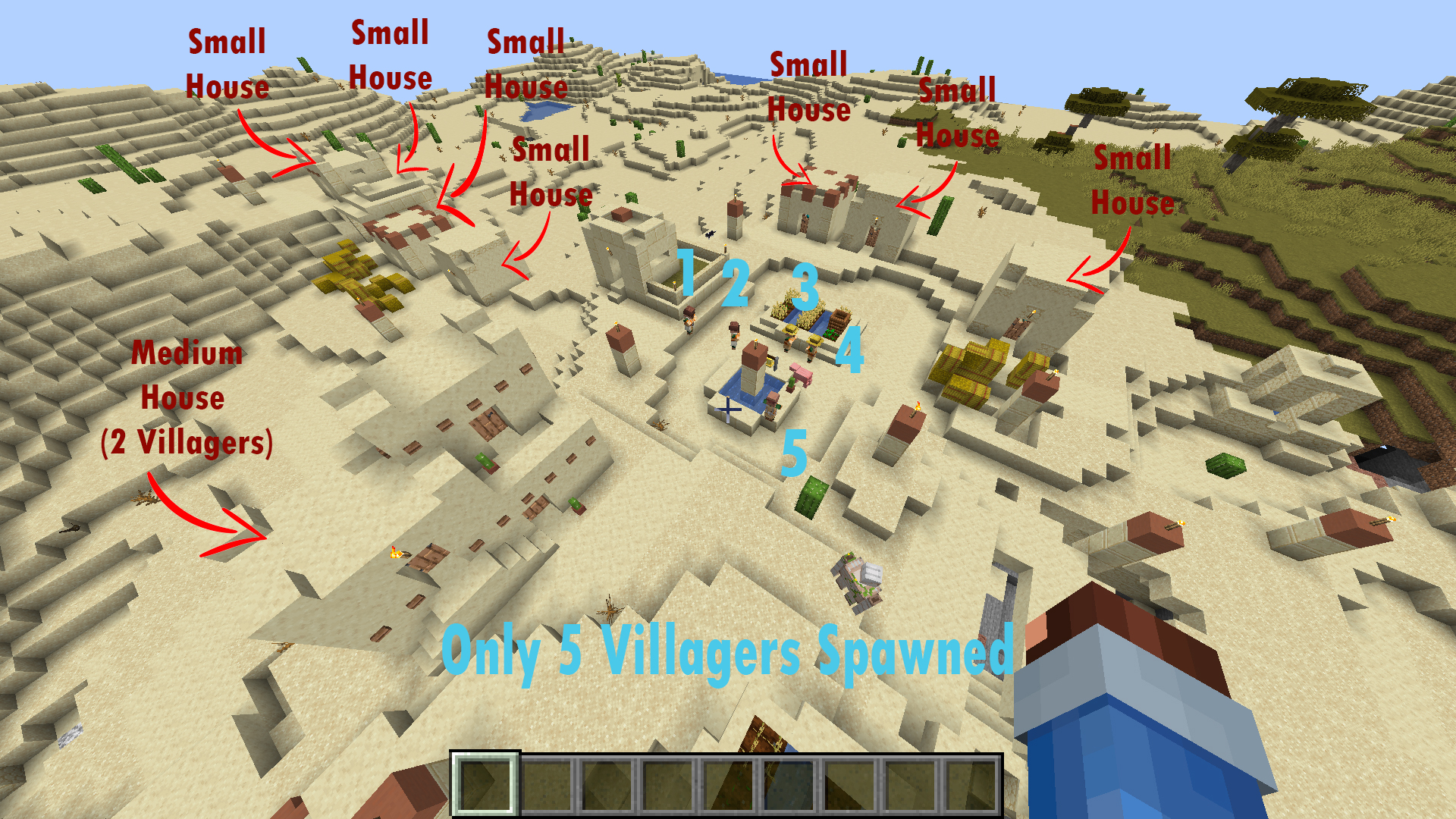 In this Seed, you will encounter with a Village that is set to spawn 9 Villagers, in the Structure Files all these Medium and Small Houses are saved with the Jigsaw Blocks that are set to spawn Desert Villagers.