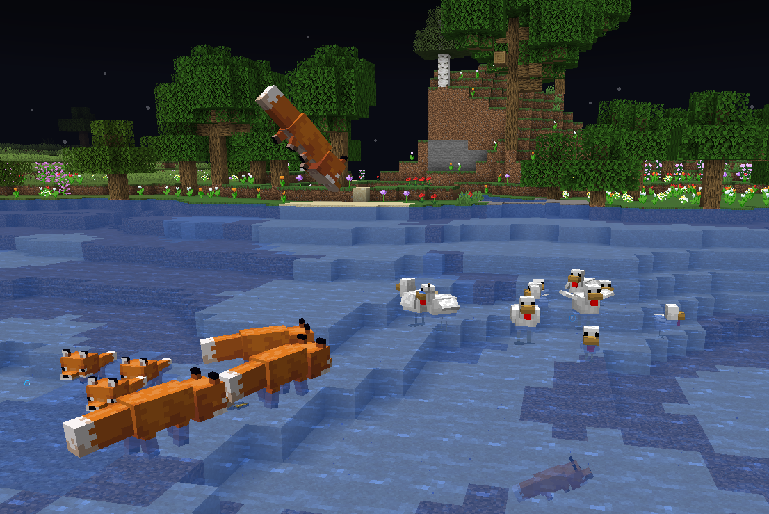 /summon chicken)Summon foxes on the surface of the water around eight blocks away from the chickens (