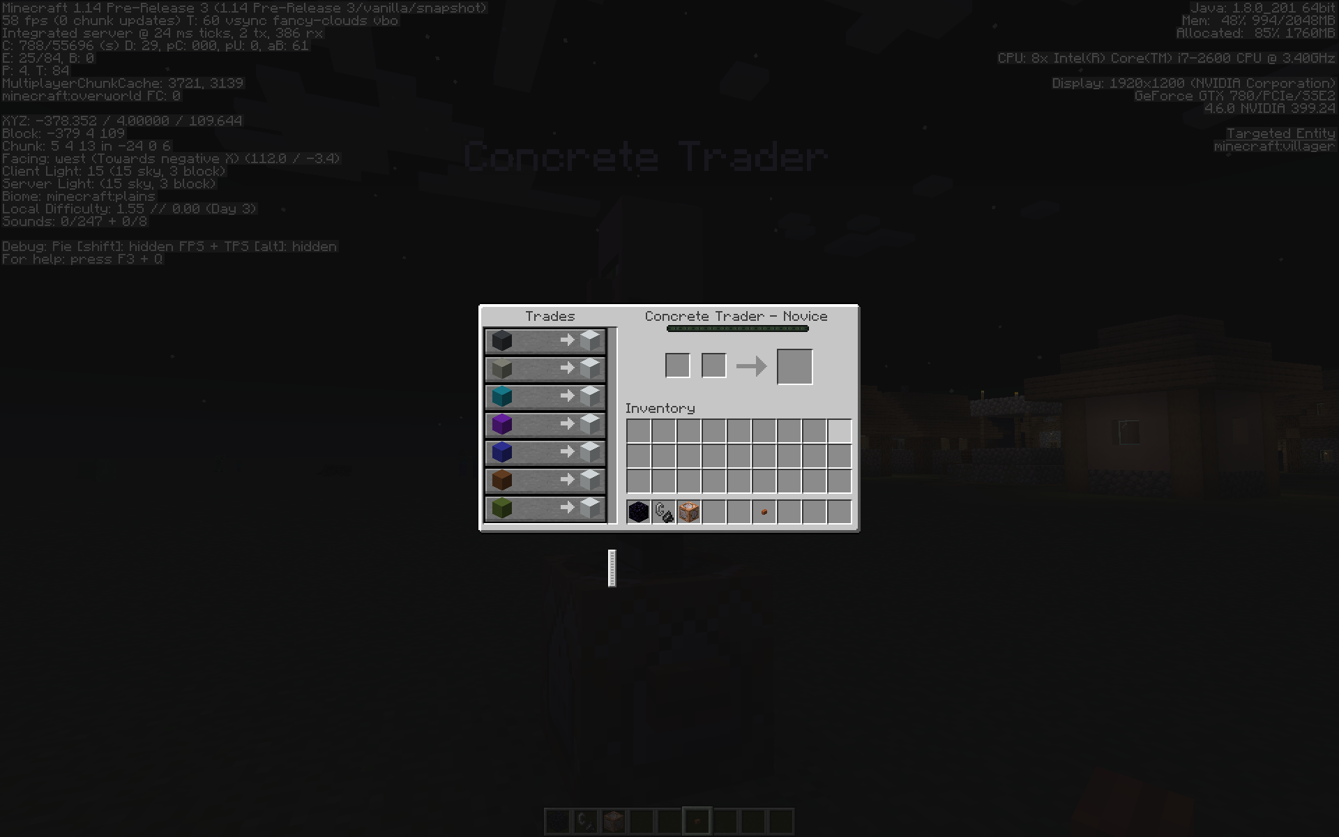 /summon villager ~ ~0.5 ~ {Invulnerable:1,PersistenceRequired:1,Silent:1,NoAI:1,Rotation:[0f,0f],CustomName:"\"Concrete Trader\"",CustomNameVisible:1,Profession:5,Career:1,CareerLevel:0,Offers:{Recipes:[{buy:{id:white_concrete_powder,Count:1},sell:{id:orange_concrete_powder,Count:1},rewardExp:0b,maxUses:2147483647},{buy:{id:white_concrete_powder,Count:1},sell:{id:magenta_concrete_powder,Count:1},rewardExp:0b,maxUses:2147483647},{buy:{id:white_concrete_powder,Count:1},sell:{id:light_blue_concrete_powder,Count:1},rewardExp:0b,maxUses:2147483647},{buy:{id:white_concrete_powder,Count:1},sell:{id:yellow_concrete_powder,Count:1},rewardExp:0b,maxUses:2147483647},{buy:{id:white_concrete_powder,Count:1},sell:{id:lime_concrete_powder,Count:1},rewardExp:0b,maxUses:2147483647},{buy:{id:white_concrete_powder,Count:1},sell:{id:pink_concrete_powder,Count:1},rewardExp:0b,maxUses:2147483647},{buy:{id:white_concrete_powder,Count:1},sell:{id:gray_concrete_powder,Count:1},rewardExp:0b,maxUses:2147483647},{buy:{id:white_concrete_powder,Count:1},sell:{id:light_gray_concrete_powder,Count:1},rewardExp:0b,maxUses:2147483647},{buy:{id:white_concrete_powder,Count:1},sell:{id:cyan_concrete_powder,Count:1},rewardExp:0b,maxUses:2147483647},{buy:{id:white_concrete_powder,Count:1},sell:{id:purple_concrete_powder,Count:1},rewardExp:0b,maxUses:2147483647},{buy:{id:white_concrete_powder,Count:1},sell:{id:blue_concrete_powder,Count:1},rewardExp:0b,maxUses:2147483647},{buy:{id:white_concrete_powder,Count:1},sell:{id:brown_concrete_powder,Count:1},rewardExp:0b,maxUses:2147483647},{buy:{id:white_concrete_powder,Count:1},sell:{id:green_concrete_powder,Count:1},rewardExp:0b,maxUses:2147483647},{buy:{id:white_concrete_powder,Count:1},sell:{id:red_concrete_powder,Count:1},rewardExp:0b,maxUses:2147483647},{buy:{id:white_concrete_powder,Count:1},sell:{id:black_concrete_powder,Count:1},rewardExp:0b,maxUses:2147483647},{buy:{id:white_concrete_powder,Count:1},sell:{id:magenta_concrete_powder,Count:1},rewardExp:0b,maxUses:2147483647},{buy:{id:orange_concrete_powder,Count:1},sell:{id:white_concrete_powder,Count:1},rewardExp:0b,maxUses:2147483647},{buy:{id:magenta_concrete_powder,Count:1},sell:{id:white_concrete_powder,Count:1},rewardExp:0b,maxUses:2147483647},{buy:{id:light_blue_concrete_powder,Count:1},sell:{id:white_concrete_powder,Count:1},rewardExp:0b,maxUses:2147483647},{buy:{id:yellow_concrete_powder,Count:1},sell:{id:white_concrete_powder,Count:1},rewardExp:0b,maxUses:2147483647},{buy:{id:lime_concrete_powder,Count:1},sell:{id:white_concrete_powder,Count:1},rewardExp:0b,maxUses:2147483647},{buy:{id:pink_concrete_powder,Count:1},sell:{id:white_concrete_powder,Count:1},rewardExp:0b,maxUses:2147483647},{buy:{id:gray_concrete_powder,Count:1},sell:{id:white_concrete_powder,Count:1},rewardExp:0b,maxUses:2147483647},{buy:{id:light_gray_concrete_powder,Count:1},sell:{id:white_concrete_powder,Count:1},rewardExp:0b,maxUses:2147483647},{buy:{id:cyan_concrete_powder,Count:1},sell:{id:white_concrete_powder,Count:1},rewardExp:0b,maxUses:2147483647},{buy:{id:purple_concrete_powder,Count:1},sell:{id:white_concrete_powder,Count:1},rewardExp:0b,maxUses:2147483647},{buy:{id:blue_concrete_powder,Count:1},sell:{id:white_concrete_powder,Count:1},rewardExp:0b,maxUses:2147483647},{buy:{id:brown_concrete_powder,Count:1},sell:{id:white_concrete_powder,Count:1},rewardExp:0b,maxUses:2147483647},{buy:{id:green_concrete_powder,Count:1},sell:{id:white_concrete_powder,Count:1},rewardExp:0b,maxUses:2147483647},{buy:{id:red_concrete_powder,Count:1},sell:{id:white_concrete_powder,Count:1},rewardExp:0b,maxUses:2147483647},{buy:{id:black_concrete_powder,Count:1},sell:{id:white_concrete_powder,Count:1},rewardExp:0b,maxUses:2147483647},{buy:{id:white_concrete,Count:1},sell:{id:orange_concrete,Count:1},rewardExp:0b,maxUses:2147483647},{buy:{id:white_concrete,Count:1},sell:{id:magenta_concrete,Count:1},rewardExp:0b,maxUses:2147483647},{buy:{id:white_concrete,Count:1},sell:{id:light_blue_concrete,Count:1},rewardExp:0b,maxUses:2147483647},{buy:{id:white_concrete,Count:1},sell:{id:yellow_concrete,Count:1},rewardExp:0b,maxUses:2147483647},{buy:{id:white_concrete,Count:1},sell:{id:lime_concrete,Count:1},rewardExp:0b,maxUses:2147483647},{buy:{id:white_concrete,Count:1},sell:{id:pink_concrete,Count:1},rewardExp:0b,maxUses:2147483647},{buy:{id:white_concrete,Count:1},sell:{id:gray_concrete,Count:1},rewardExp:0b,maxUses:2147483647},{buy:{id:white_concrete,Count:1},sell:{id:light_gray_concrete,Count:1},rewardExp:0b,maxUses:2147483647},{buy:{id:white_concrete,Count:1},sell:{id:cyan_concrete,Count:1},rewardExp:0b,maxUses:2147483647},{buy:{id:white_concrete,Count:1},sell:{id:purple_concrete,Count:1},rewardExp:0b,maxUses:2147483647},{buy:{id:white_concrete,Count:1},sell:{id:blue_concrete,Count:1},rewardExp:0b,maxUses:2147483647},{buy:{id:white_concrete,Count:1},sell:{id:brown_concrete,Count:1},rewardExp:0b,maxUses:2147483647},{buy:{id:white_concrete,Count:1},sell:{id:green_concrete,Count:1},rewardExp:0b,maxUses:2147483647},{buy:{id:white_concrete,Count:1},sell:{id:red_concrete,Count:1},rewardExp:0b,maxUses:2147483647},{buy:{id:white_concrete,Count:1},sell:{id:black_concrete,Count:1},rewardExp:0b,maxUses:2147483647},{buy:{id:white_concrete,Count:1},sell:{id:magenta_concrete,Count:1},rewardExp:0b,maxUses:2147483647},{buy:{id:orange_concrete,Count:1},sell:{id:white_concrete,Count:1},rewardExp:0b,maxUses:2147483647},{buy:{id:magenta_concrete,Count:1},sell:{id:white_concrete,Count:1},rewardExp:0b,maxUses:2147483647},{buy:{id:light_blue_concrete,Count:1},sell:{id:white_concrete,Count:1},rewardExp:0b,maxUses:2147483647},{buy:{id:yellow_concrete,Count:1},sell:{id:white_concrete,Count:1},rewardExp:0b,maxUses:2147483647},{buy:{id:lime_concrete,Count:1},sell:{id:white_concrete,Count:1},rewardExp:0b,maxUses:2147483647},{buy:{id:pink_concrete,Count:1},sell:{id:white_concrete,Count:1},rewardExp:0b,maxUses:2147483647},{buy:{id:gray_concrete,Count:1},sell:{id:white_concrete,Count:1},rewardExp:0b,max