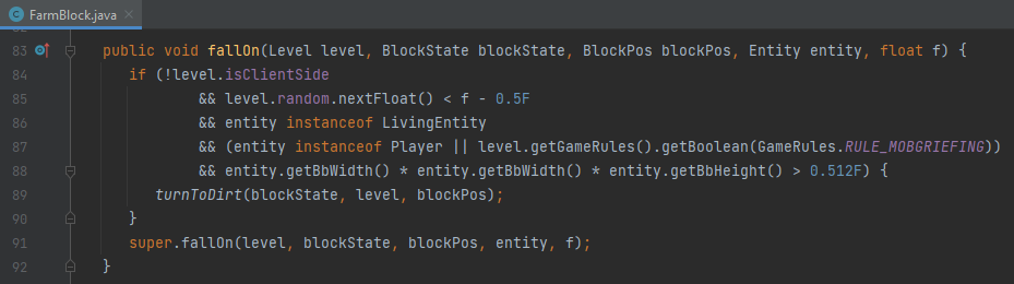 ...If we look at the above class, we can see that there are only two necessary checks that are carried out before allowing villagers to trample farmland. One of these checks is to quite simply see if the entity falling on the farmland is a living entity and if it is, the other check is then to see if "mobGriefing" gamerule is set to "true". If these two requirements are met along with the other criteria within the "if" statement, the farmland can be trampled. The game doesn't check to see if the living entity is a villager before allowing them to trample farmland, therefore resulting in this problem occurring.