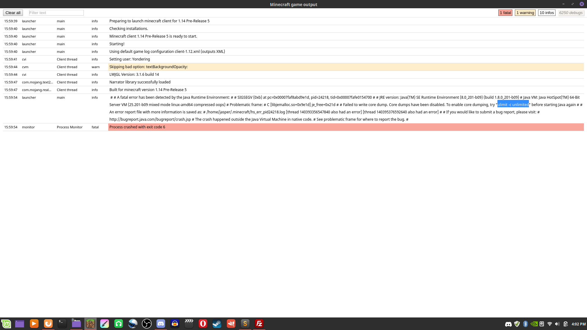 1. # A fatal error has been detected by the Java Runtime Environment: # # SIGSEGV (0xb) at pc=0x00007faf8abd9e1d, pid=24218, tid=0x00007fafe0154700 # # JRE version: Java(TM) SE Runtime Environment (8.0_201-b09) (build 1.8.0_201-b09) # Java VM: Java HotSpot(TM) 64-Bit Server VM (25.201-b09 mixed mode linux-amd64 compressed oops) # Problematic frame: # C [libjemalloc.so+0x9e1d] je_free+0x21d # # Failed to write core dump. Core dumps have been disabled. To enable core dumping, try "ulimit -c unlimited" before starting Java again # # An error report file with more information is saved as: # /home/jasper/.minecraft/hs_err_pid24218.log [thread 140393356547840 also had an error] [thread 140395376592640 also had an error] # # If you would like to submit a bug report, please visit: # http://bugreport.java.com/bugreport/crash.jsp # The crash happened outside the Java Virtual Machine in native code. # See problematic frame for where to report the bug. #