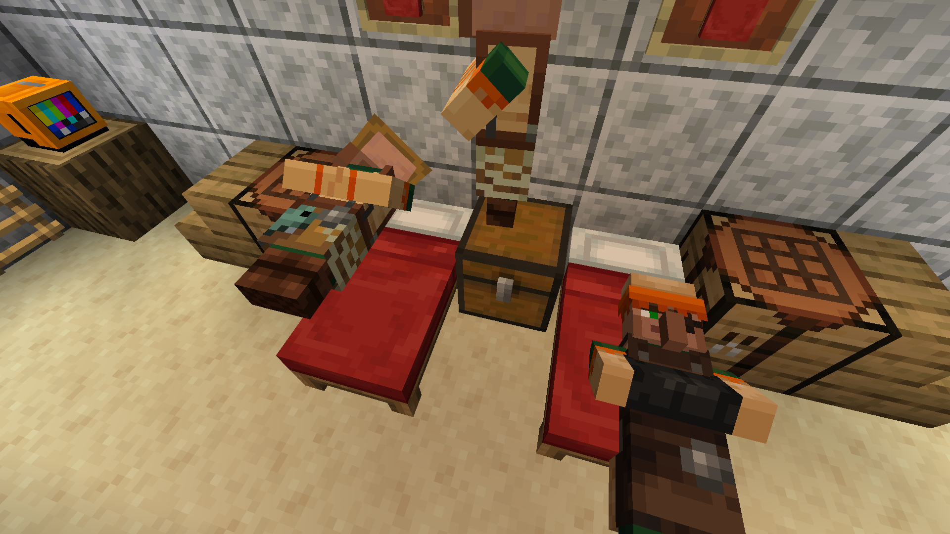 I am addressing two issues at once because the screenshots depicture both at once. I hope that is no problem. Anyway, as visible in the attached pictures it is possible to push the villagers around in their bed to a great extent. One can push their heads into the wall, for instance. Regarding the other issue, it seems like more than one villager tries to sleep in the same bed. While one is asleep, the other one stares at them the whole night. They even ignore other free beds as if they wanted to claim the occupied one.